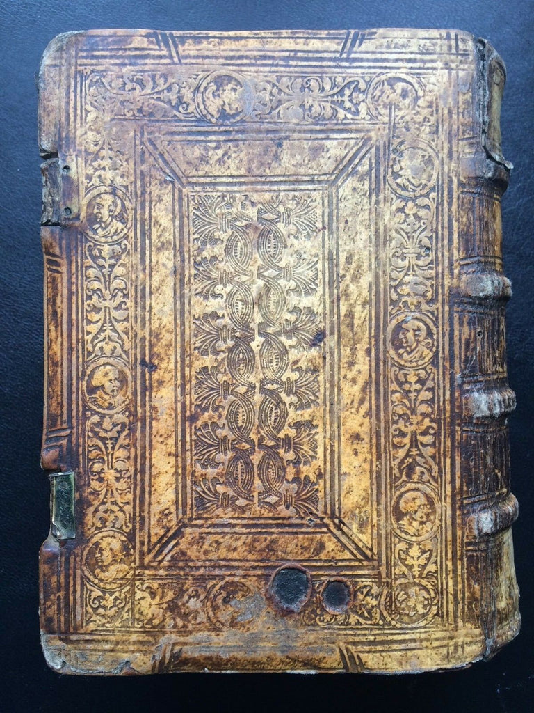 Bound with decorated pigskin vellum over contemporary wooden boards. Both front and back covers display intricate designs with nets, castors, medallions, portraits, and cold-stamped figures. Upper-most metal clasp remains intact. Spine with 4 raised bands.