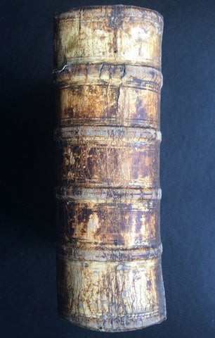 CONDITION: Good condition; lacking the first blank sheet with the printer brand of Tournes; several ex-libris markings, as well signatory markings, on front title & front pastedown, including bookstamps & a pasted label beneath the title vignette (as pictured); a trace of wetness affecting the first 100 sheets; various other instances of minor soiling and small stains; small portion of lower margin torn away pg.7-8 (not affecting text, see photo showing Noah's Ark); textblock shows gathering at rearmost section, as well as a small section bunched near mid-textblock (see photograph); page edges are worn and show soiling & patina; one clasp remaining preserved intact but lacking the other; decorated pigskin boards with minor defects of use as well as a small split of the lower inter-seam at the foot of the spine & cracking of the front gutter; binding otherwise secure; covers show smoothing of leather as well as age darkening & soiling, with small gaps of leather, wear of corners & blunt edges, stitched repair on the top spine nerve, and a split of the leather at the front-lower seam & top-rear seam; a correct copy otherwise despite flaws and several binding defects. |
