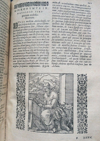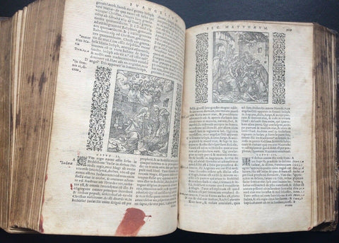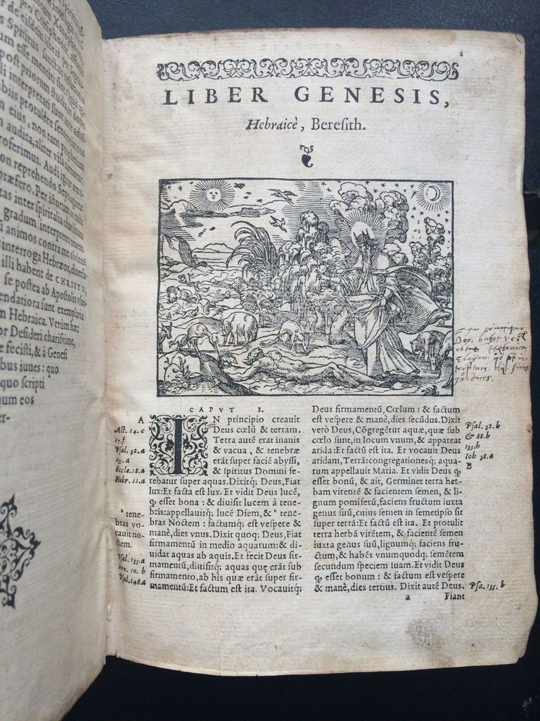 Rare illustrated Latin Renaissance Bible published by the famed Lyonnais printer, Jean de Tournes in 1558. It is a re-edition, page for page, printed with the same type as the previous 1554 edition. Richly embellished with 198 woodcut illustrations by Petit Bernard, with 115 in the Old Testament and 83 in the New Testament (Cartier, 391). The in-text woodcut vignettes appear throughout and are superbly rendered. Title page presented in a frame engraved with arabesques. Each of the New Testament woodcut prints is also framed on both sides by a vignette of arabesques. Text is presented in two columns with marginal notes, both printed and handwritten. Embellished with ornate capitals and endpieces. Without the first blank sheet on which appeared the printer brand of Tournes. Includes an index for the Old and New Testaments, as well as notable sentences of the New Testament.