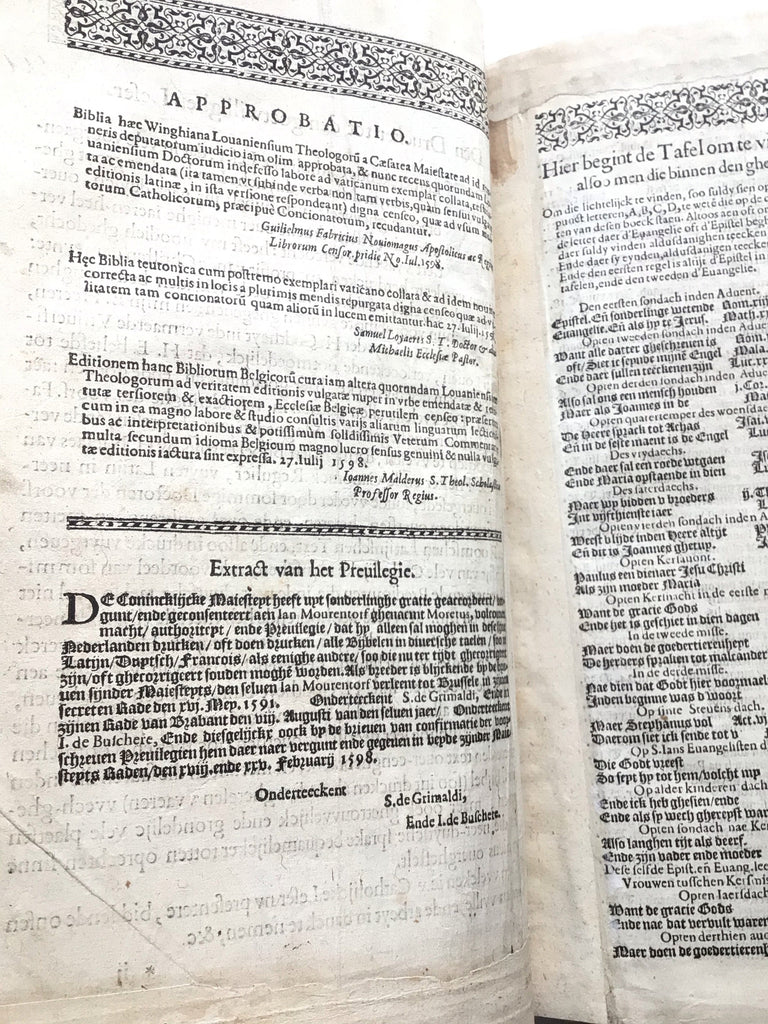 FULL TITLE: DAT IS DE GEHEELE HEYLIGHE SCHRIFTURE BEDEYLT INT OUT ENDE NIEU TESTAMENT: VAN NIEUS MET GROOTE NEERSTICHEYT OVERSIEN, ENDE NAER DEN LESTEN ROOMSCHEN TEXT VERBETERT DOOR SOMMIGHE DOCTOREN INDER HEYLIGHER GODTHEYT INDE VERMAERDE UNIVERSITEYT VAN LOVEN.