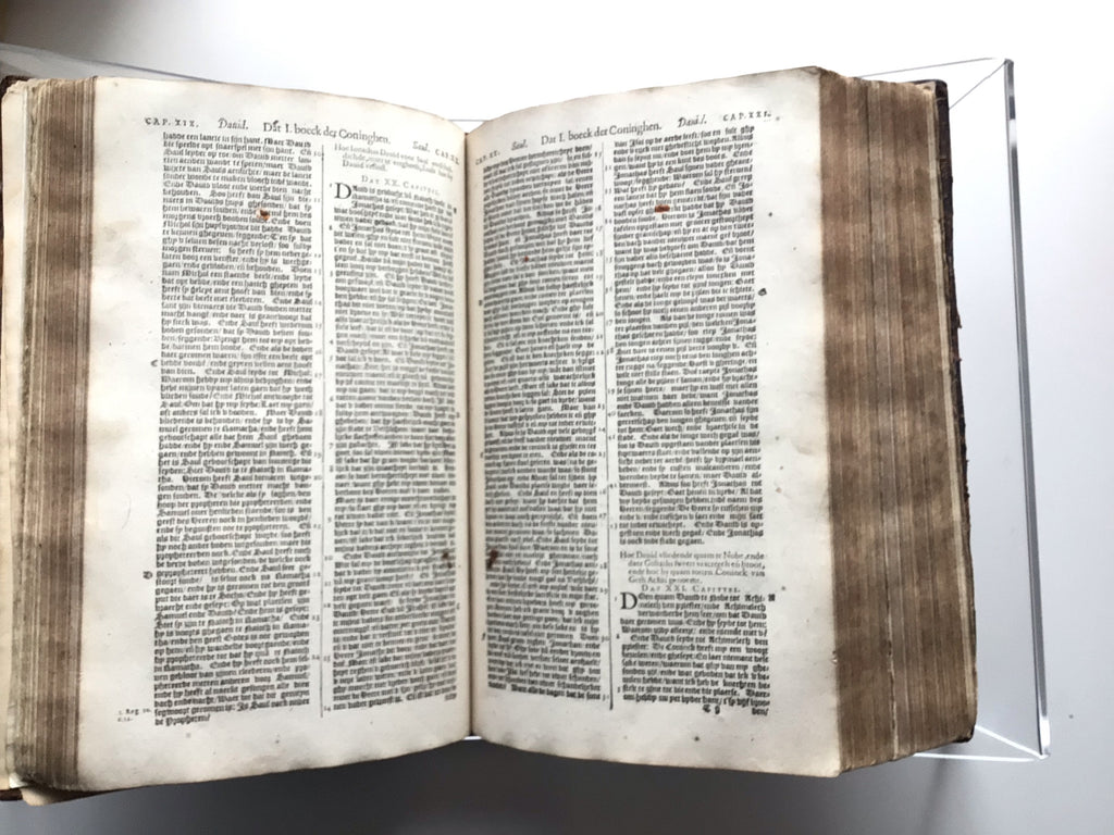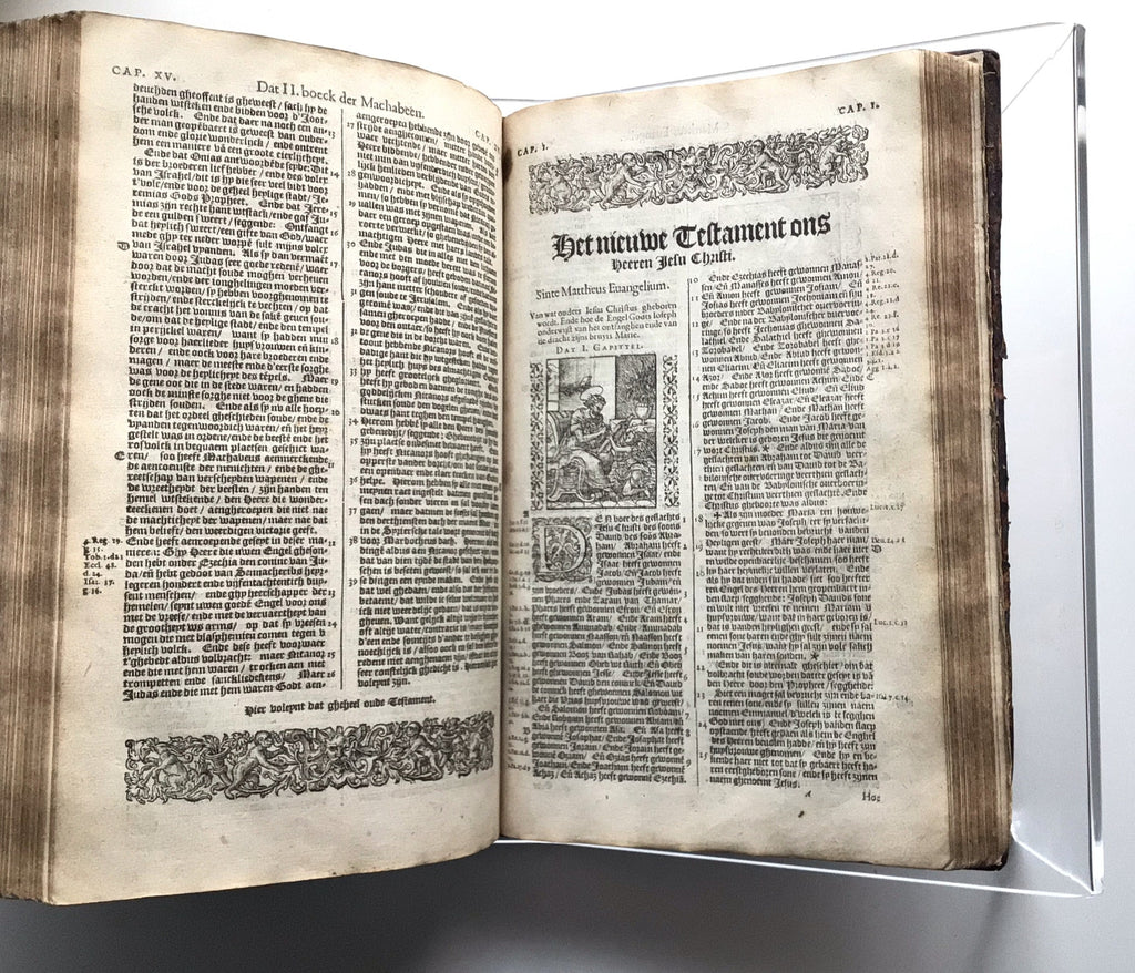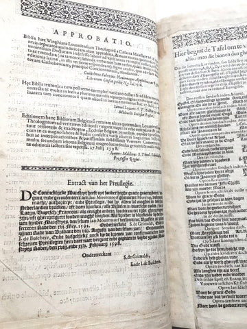 Biblia Sacra. Dat is de geheele heylighe schrifture bedeylt int out ende nieu Testament: van nieus met groote neersticheyt oversien, ende naer den lesten Roomschen text verbetert door sommighe doctoren inder Heyligher Godtheyt inde vermaerde universiteyt van Loven. Antwerp: [J. Moretus & J. van Keerberghen, 1599]. [Typis Danielis Vervliet, & Henrici Swingelij (colophon)].