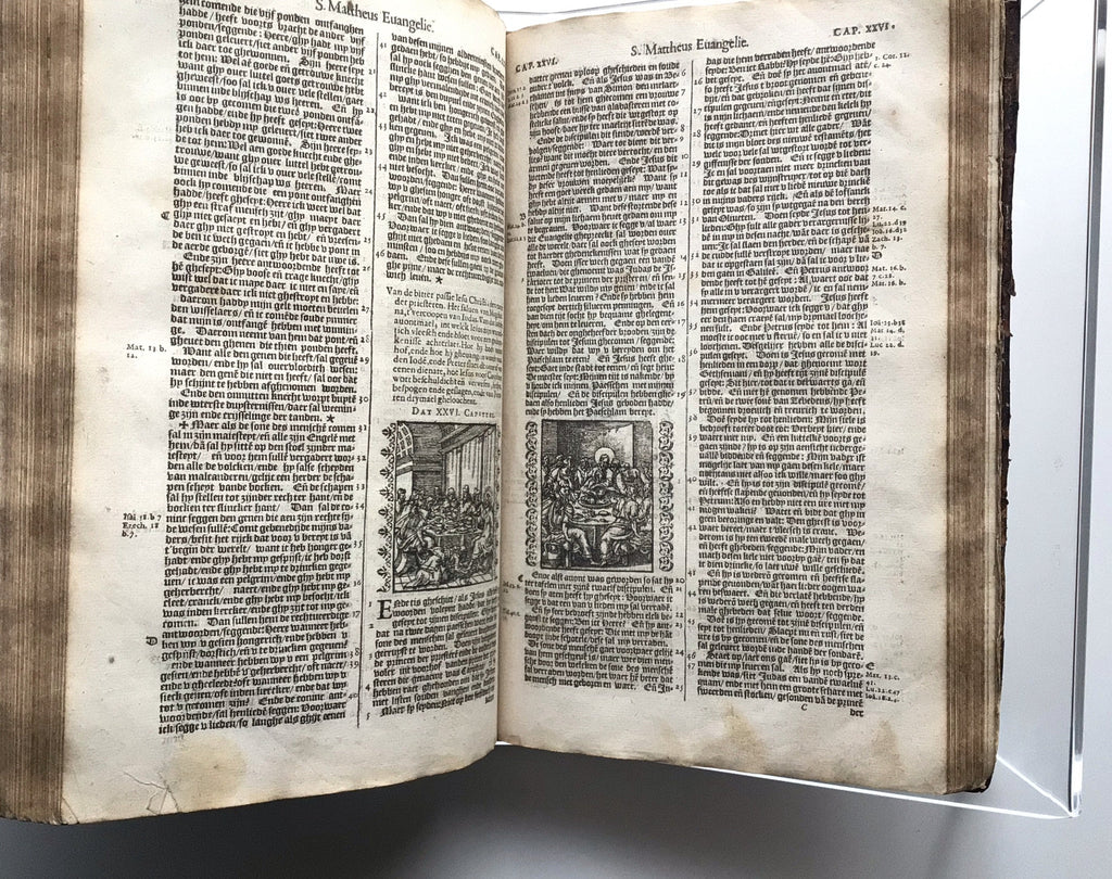 "In 1599 a new version of the Dutch Louvain Bible appeared in Antwerp from the press of Jan Moerentorf (Moretus), 33 years after the publisher’s father-in-law Christopher Plantin had published the previous Dutch Bible, and 22 years after the most recent Dutch New Testament. The so-called ‘Moerentorf Bible’ was revised on the basis of the Sixto-Clementine Vulgate that had been released in 1592." (François 2015, 276). The edition "remained the standard version for Catholics in Belgium and the Netherlands until the late nineteenth century (Agten 2020 134-46)” (Dy & François 2023, 402).