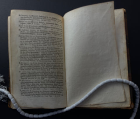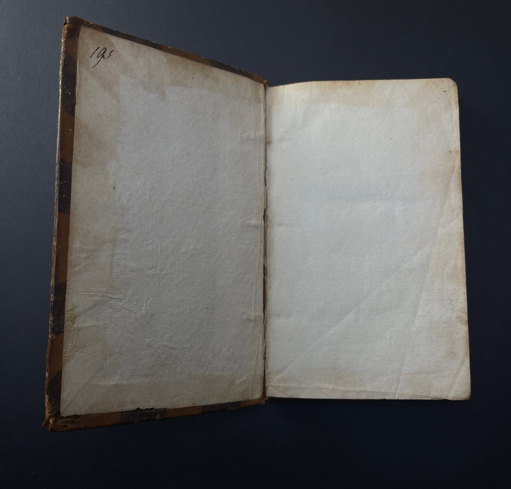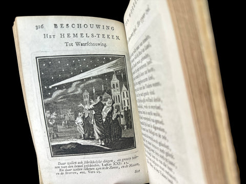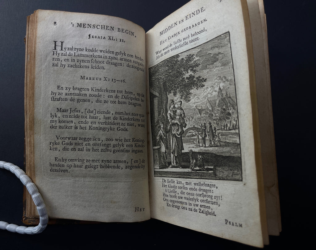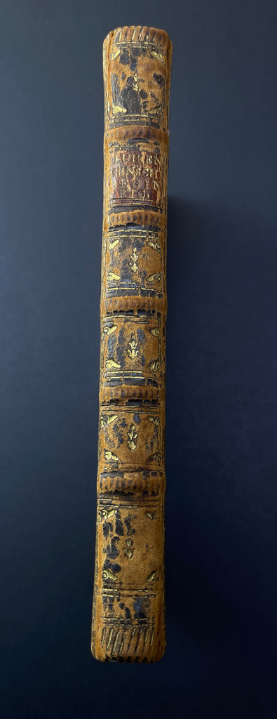 [Emblem Book/Emblemata] Jan Luiken. Des menschen begin, midden en einde. Amsterdam: Erven F. Houttuyn,  1768. 18mo., (34), 103, (7) pages. Engraved frontispiece, title page with engraved vignette, portrait of the author, and 50 engraved copper emblems by Luyken. Bound in contemporary brown calf leather, spine with five raised bands and decorated with faded gilt fleurons.