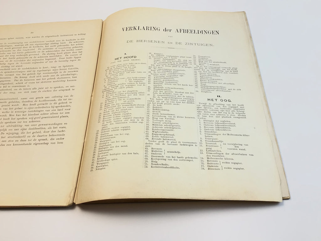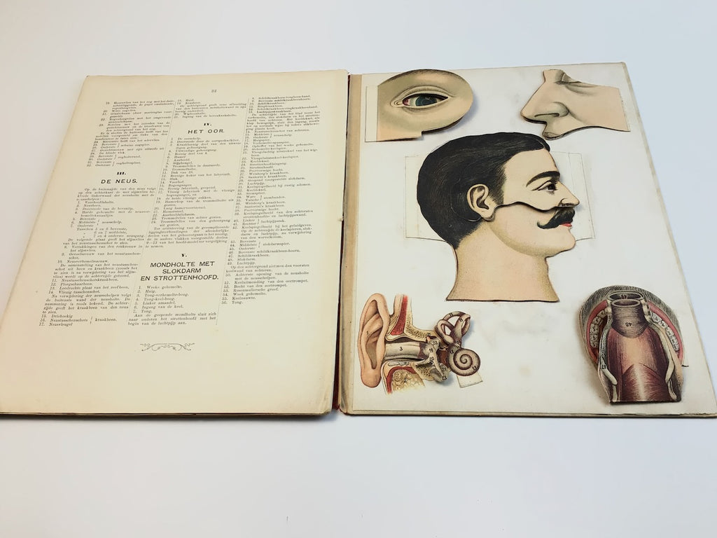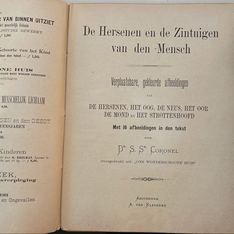 FULL TITLE: De hersenen en de zintuigen van den mensch: verplaatsbare, gekleurde afbeeldingen van de hersenen, het oog, de neus, het oor, de mond en het strottenhoofd door Dr. S. Sr Coronel. [The Brain and Senses of Man: Transportable, Colored Pictures of the Brain, Eye, Nose, Ear, Mouth, and Larynx by Dr. S. Sr Coronel.]