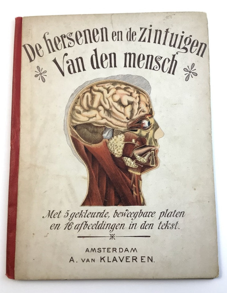 [Anatomy/Medicine] Coronel, S. De hersenen en de zintuigen van den mensch. Amsterdam: A. van Klaveren, n.d.(c.1900). 8vo., 32 pp.: ill, 1 page glued to the back board with five moveable/foldout anatomical coloured diagrams; Original illustrated cardboard covers with red linen spine.
