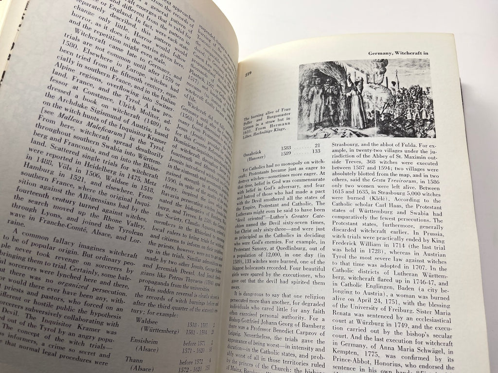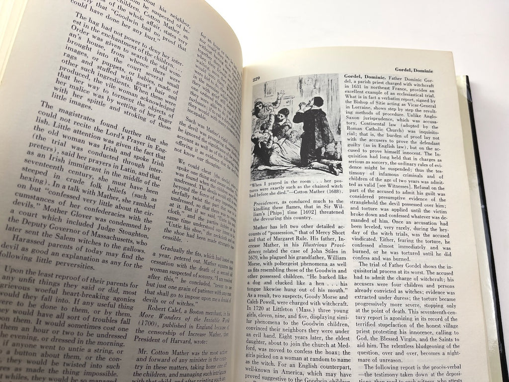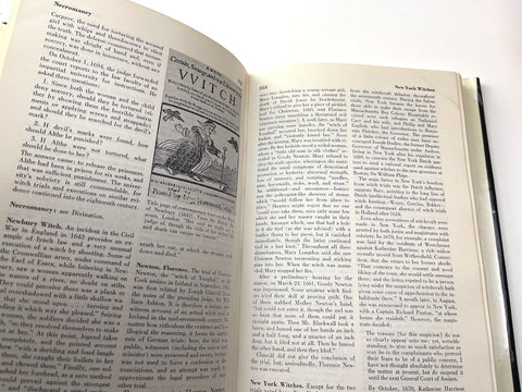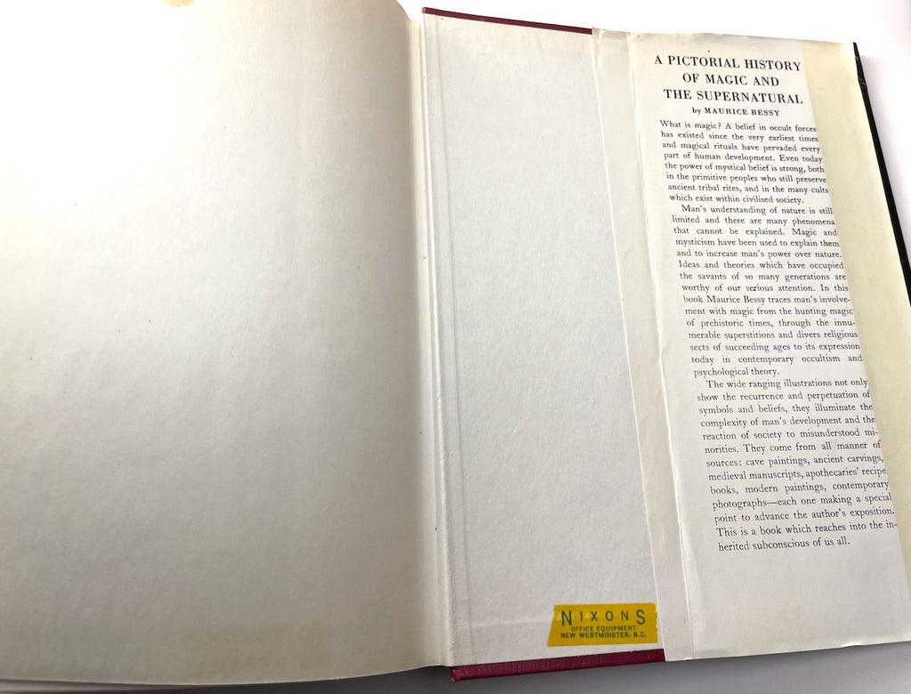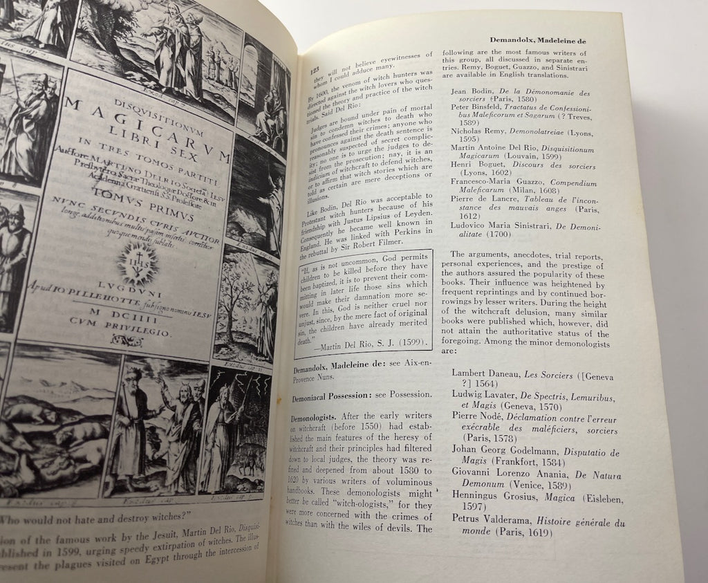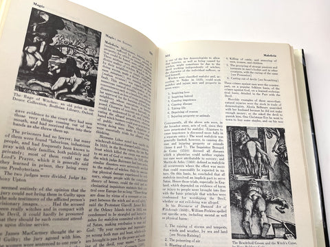The front flap describes this book as "the most authoritative and comprehensive body of information about witchcraft and demonology ever collected together in a single volume...a full-scale compendium of fact, history and legend about every phase of this fascinating subject, from its origins in medieval times to its last eruptions in the eighteenth century...Many of the 250 remarkable illustrations are published in this book for the first time. They come from rare books, contemporary prints and old manuscripts."