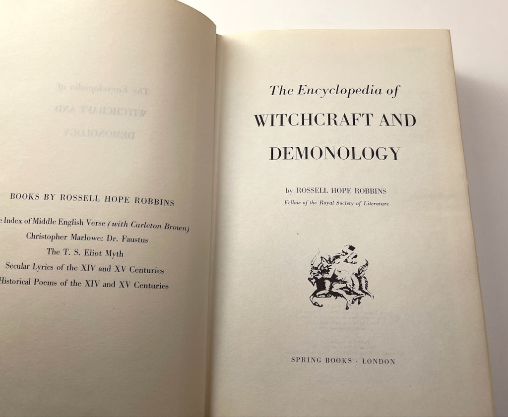 Rossell Hope Robbins. The Encyclopedia of Witchcraft and Demonology. London: Spring Books, 1967. Fourth Impression, 8vo. pp.571; 250 in-text illustrations; with a select bibliography of 1140 items; Dust jacket over red cloth binding.