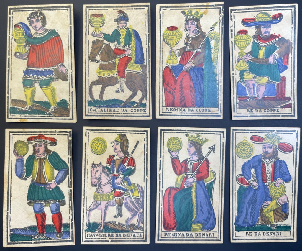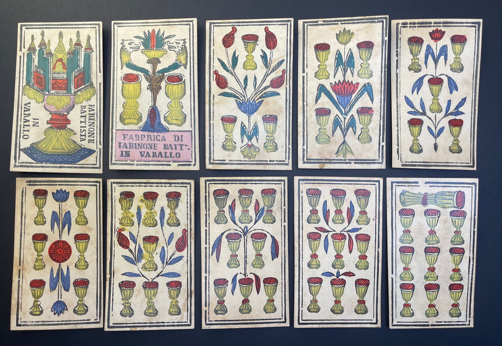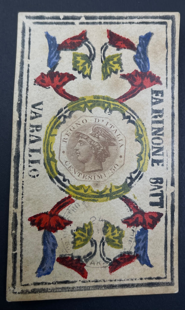 · Cards: Ace of Cups with Farinone Batt In Varallo, two of Cups with Fabbrica di Farinone Batt in Varallo, Ace of Swords & Ace of Wands with Farinone in Varallo, & Farinone Batt Varallo and Regno d'Italia Centissimi 50 tax-stamp in use from 1883-1914 on Ace of Coins