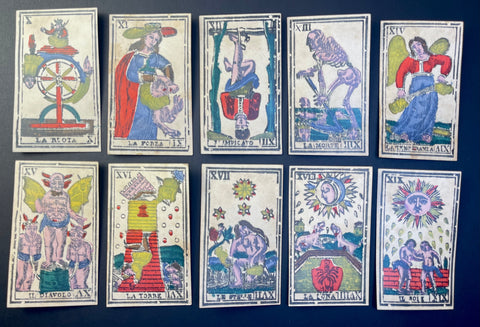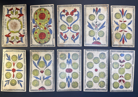 CONDITION: good condition; complete 78 cards; signs of minor wear from use, several cards pictured with staining & damages; cards slightly bowed. (see photographs).