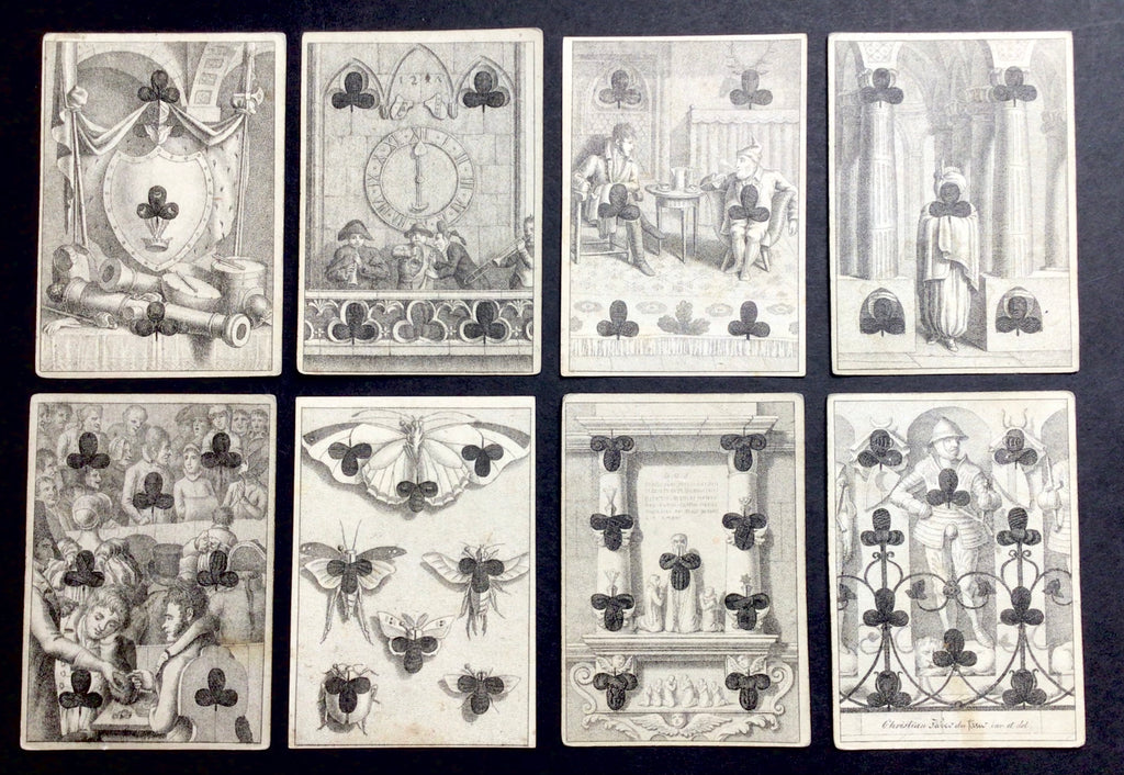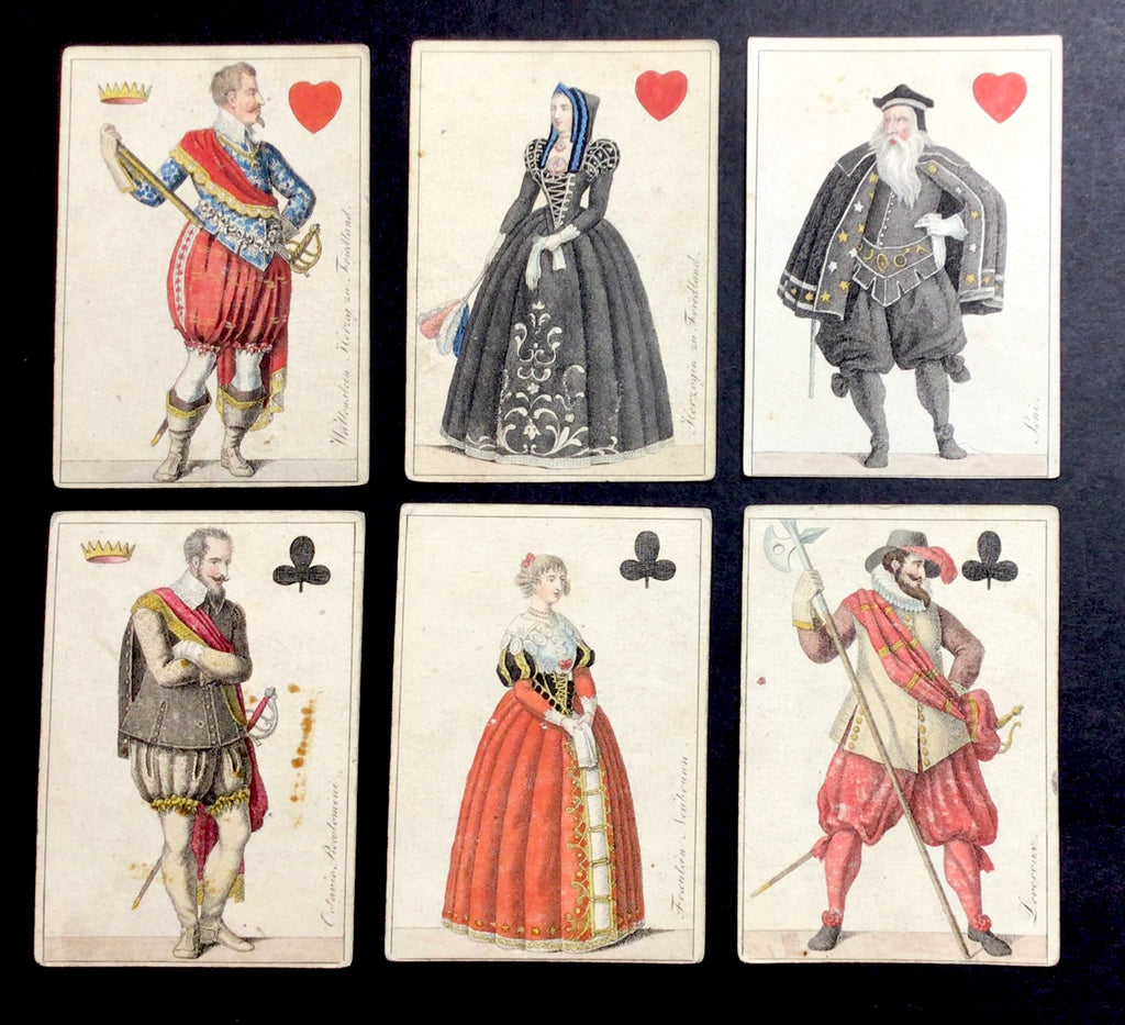 CONDITION: Very good condition; incomplete (45 of 52 cards), without box or almanac; some minor signs of wear and stains; slight soiling from use; missing 4 & 5 of Diamonds, 2, 3, and 7 of Spades, 2 of Clubs, 6 of Hearts; see photographs. |
