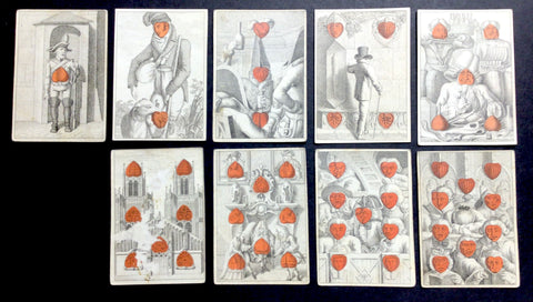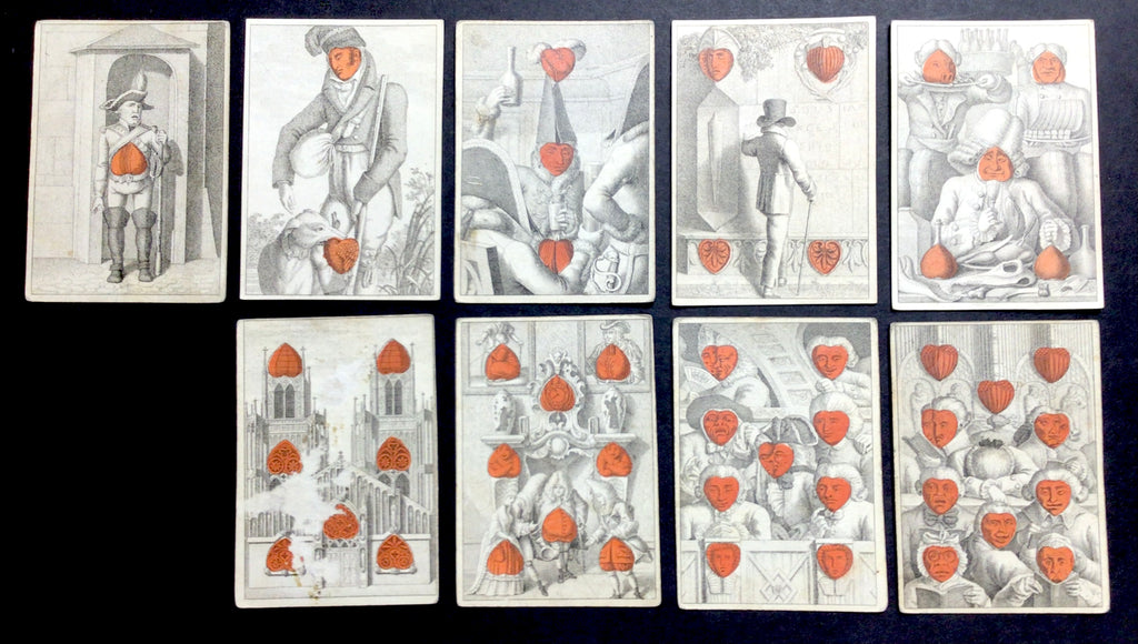 Description: Published in 1807, the court cards of this almanac deck were designed after the characters in Friedrich Schiller's play trilogy, "Wallenstein." The deck was the third in a series issued annually by J.C. Cotta to mark the New Year between 1805 and 1811 (except 1808)."(P)ublished as almanacs, each card correspond(s) to one of the 52 weeks of the year."