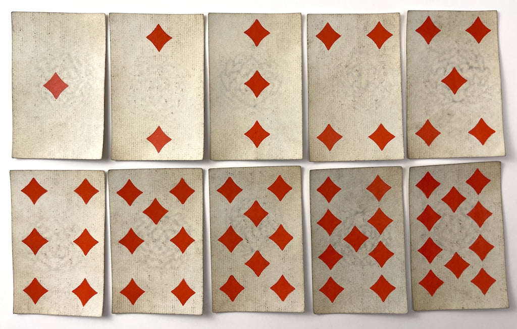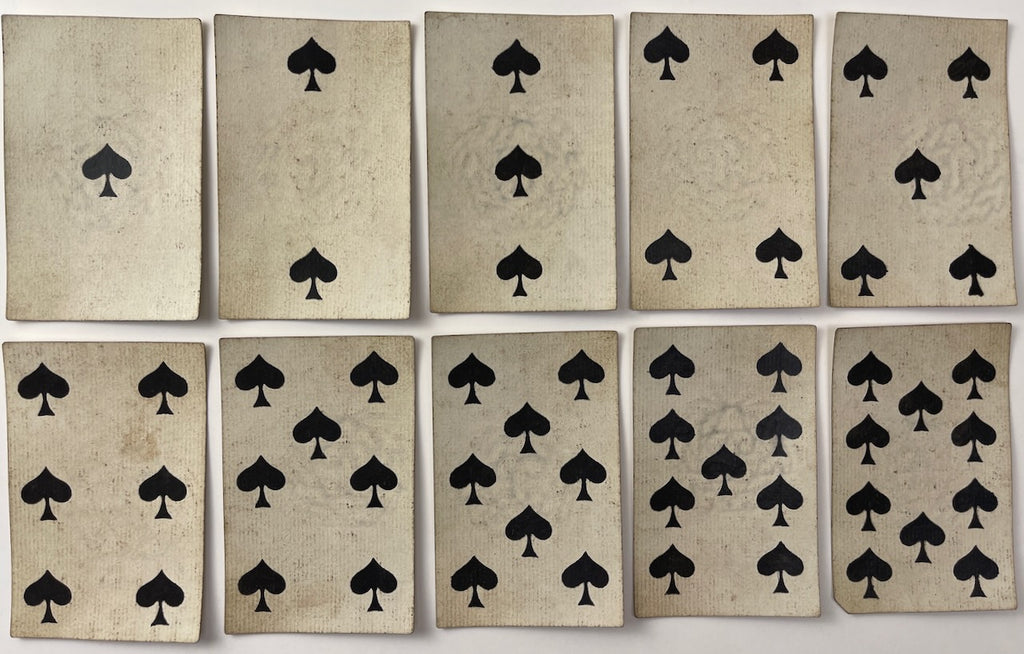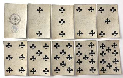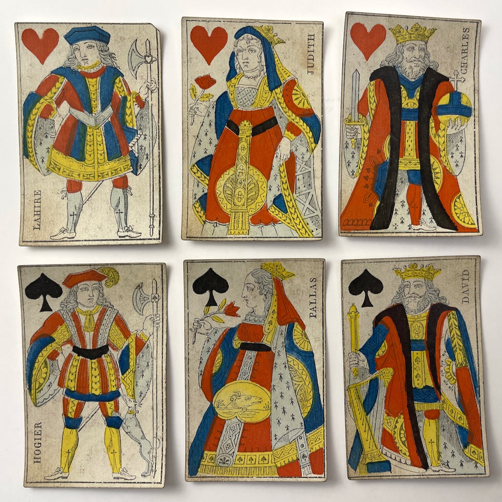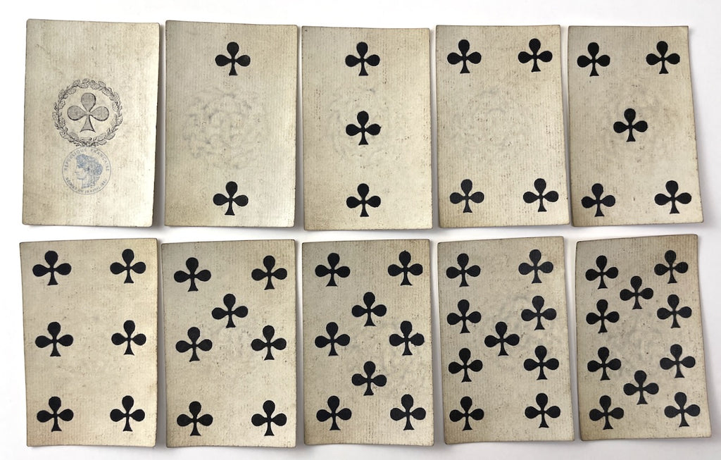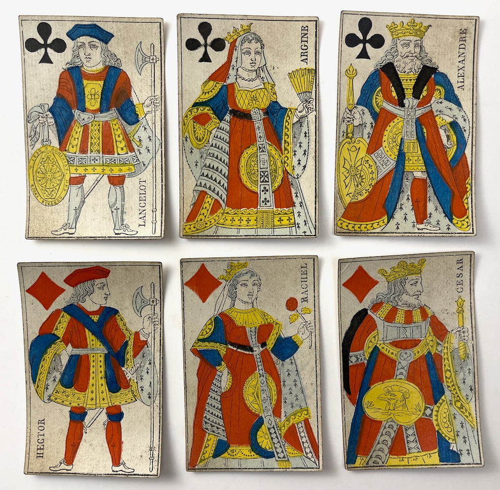 · Cards: "GATTEAUX" in very small print & "ADMINIST. DES CONTRIB. INDIR. 1850" on the Jack of Clubs shield; oak wreath on Ace of Clubs (w/ Republique Francais Avril 12, 1890 tax-stamp); names on all of the court cards.
