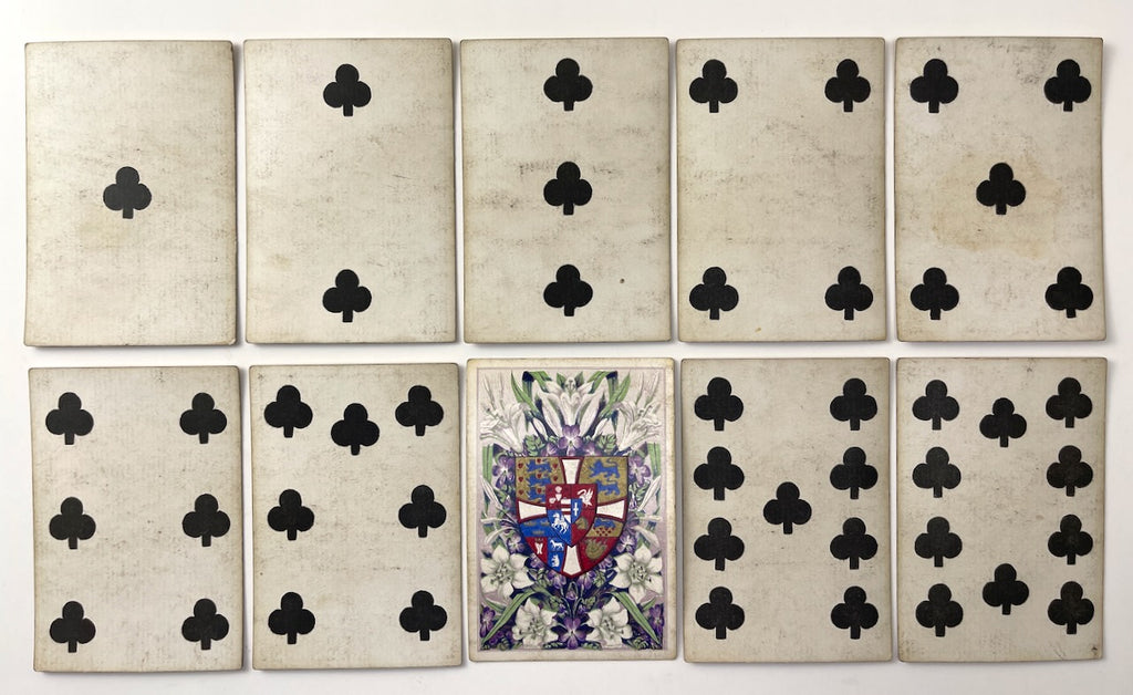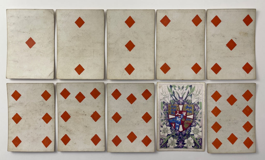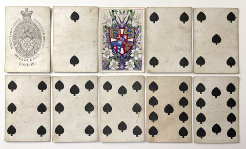 Description: c.1855-65 De La Rue & Co. Playing Cards with Owen Jones Emblem of the Princess of Wales, no indices and one-way pips. Incomplete with 51/52 cards. Chromolithographic stencils.