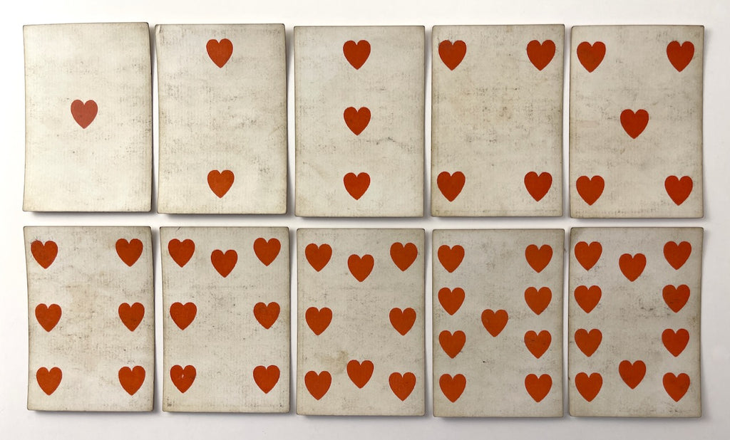 CONDITION: Good condition; incomplete, 48/52 cards (lacking K of hearts, 3 of spades, 8 of clubs, & 9 of diamonds); signs of wear and soiling from use; occasional stains; rubbed edges and bumped corners; age discoloration and minor signs of patina. (see photographs)