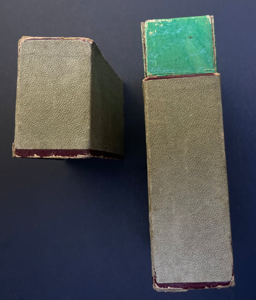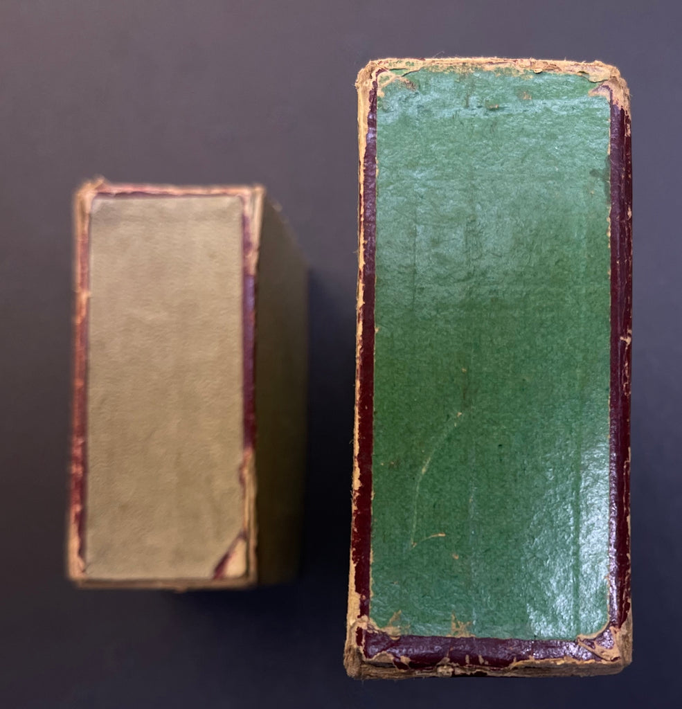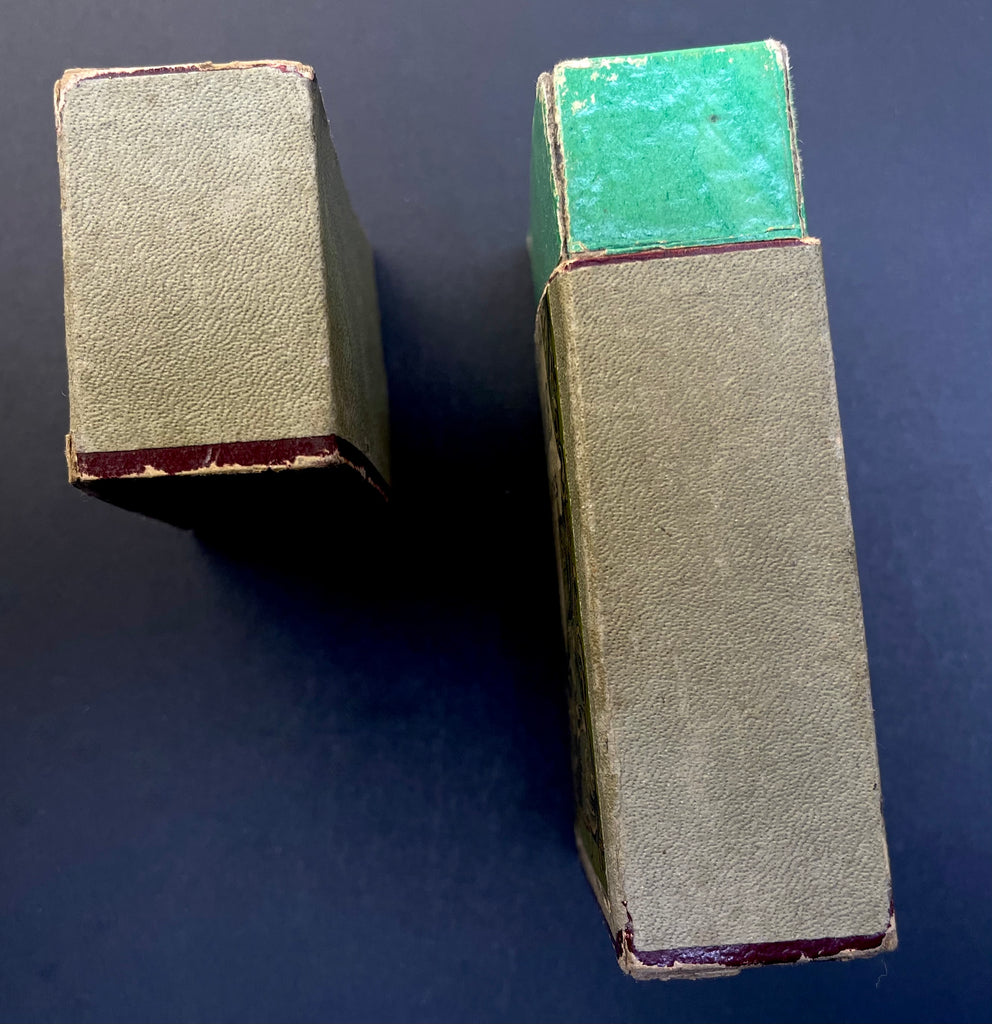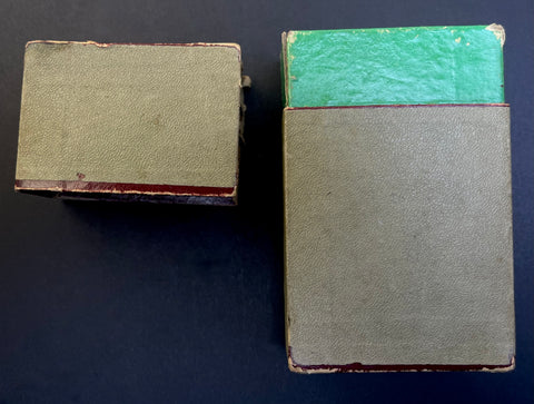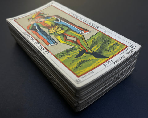 Good condition, complete with telescopic box and 78 cards. The deck has a very slight warp due to the thinner cardstock. Corner and edge wear show some use. Each card has handwritten French inscriptions in black pen, ink, and pencil. The box is well preserved and in good condition overall, though missing one side of the upper box sleeve. The inner box sleeve has split seams in the top part of the box (see pictures), and there are some lacks, rubs and bumps.