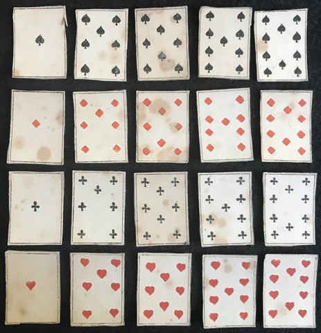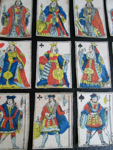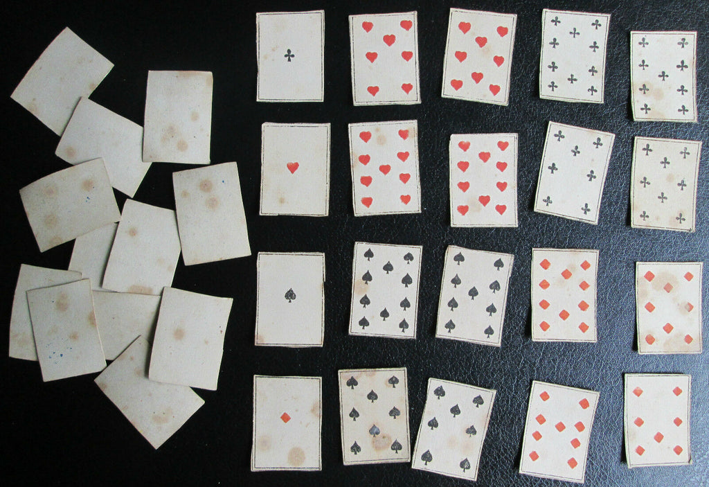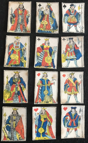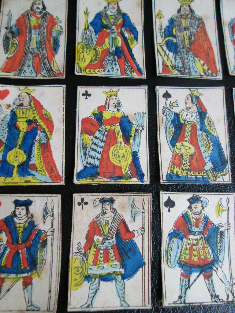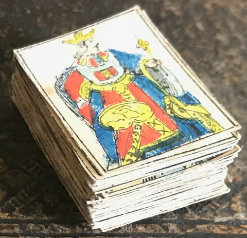 Miniature cards appear to be from a centprint-sheet and are matching to the style of cards produced during the 1st Napoleonic Empire of 1800 with French suit markers. These miniature centprints or catchpenny print cards have standing court royals, one-way pips and no indices. Hand-painted in the usual style of Dutch centprint makers. Paris pattern court designs of early 1800s. The designs are an early variant of the 'Paris' pattern which had spread to the Low Countries from Northern France. All of the cards have a blank white reverse.