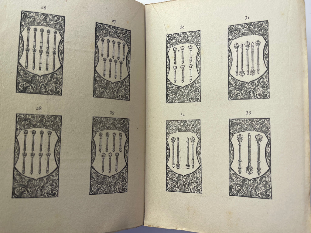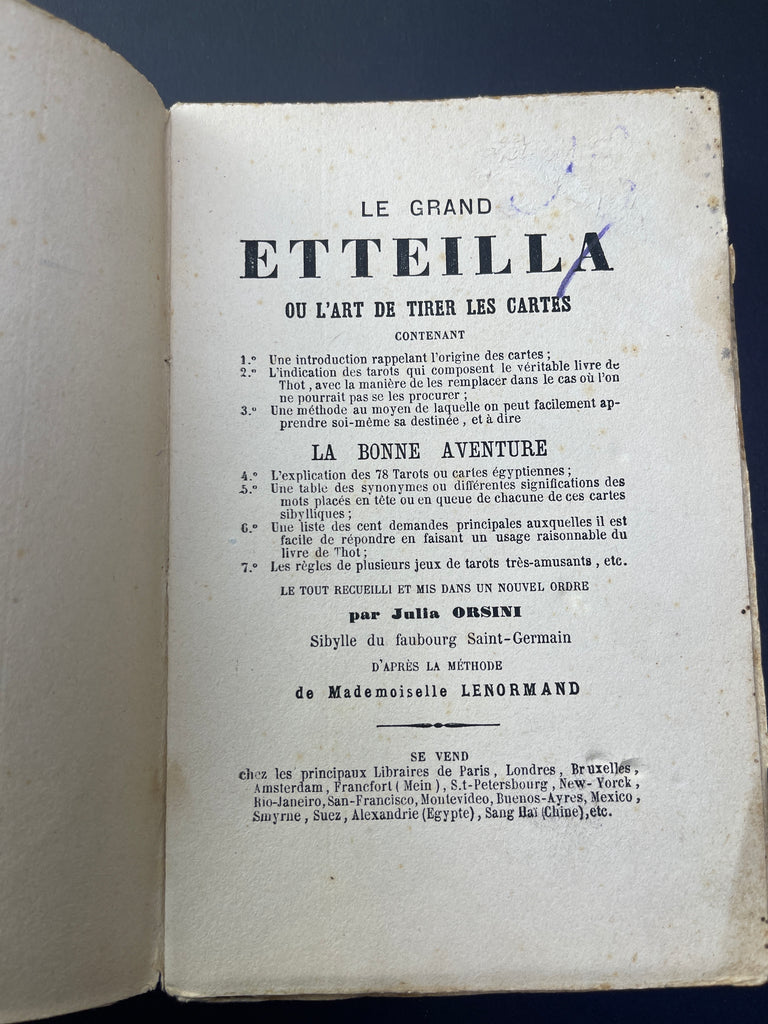 Orsini, Julia (pseud.Bloquel, Simon). Le Grand Etteilla ou L'art de tirer les cartes et de dire la bonne aventure et dire la Bonne Aventure. Paris: Delarue, Lille Blocquel-Castiaux, n.d. [c.1884]. Later Edition (4th?), 16mo., pp.204 (28), (pp. 24 illustrations + pp4 Table of Contents); 24 pages of Le Grand Etteilla II (Lismon) and Le Grand Oracle des Dames, Etteilla III cards illustrated in black and white illustrations of cards; The Major Arcana, Courts, are given full page illustrations and are from the Grand Etteilla II (Lismon) deck, while the pip illustrations are four per page and from the Etteilla III, Le Grand Oracle des Dames (Lismon). Paper cover bindings, front cover with portrait of Etteilla [which is actually a portrait of Giovanni Pietro Maffei (1553-1603)], Italian Jesuit author], back cover with advertising for a list of other books by H. Delarue; the front cover has a remnant sticker from a previous owner, and reads "Librairie.- P(a?)... /P. ALLÈG.../ à A...".