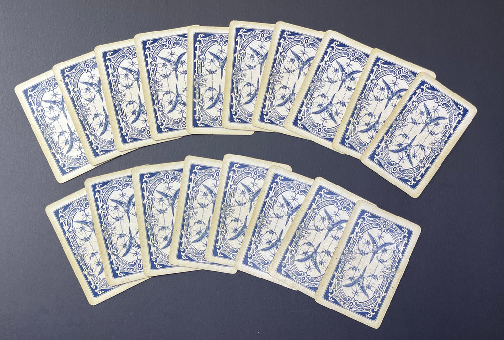 Description: "There is a traditional order for the designs in a standard Lenormand fortune-telling pack, starting with a male rider on card 1. However, in this pack from Piatnik dating from c1960 according to Jensen¹, the order is different, with a man in a top hat and carrying a cane on card 1 – the same image as appears on card 28 in a modern pack. Cards 1 to 4 are the four Aces, followed by the remaining cards in strict order (K, Q, J, 10, 9, 8, 7, 6 on cards 5 to 12, etc.), whereas in a modern pack the suits are jumbled up. The maker’s name appears in full on cards 1 and 3, as it does on cards 25 and 28 in a modern pack. The maker’s initials (FPS) appear in the top right-hand corner of every card (as they do in a modern pack), and twice on cards 3 and 18." World of Playing Cards, 2023