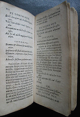 Very rare and significant reference work of ancient literature. A collection of comedic proverbs by classical authors. Important historic remnant of many authors of lost and forgotten civilizations of antiquity. Woodcut headpieces; Italic, Greek, and Roman letter
