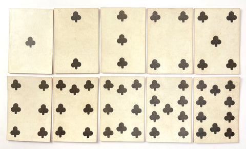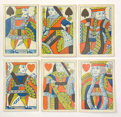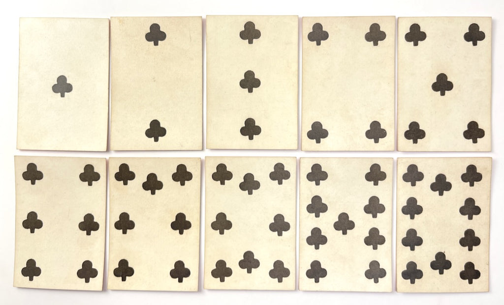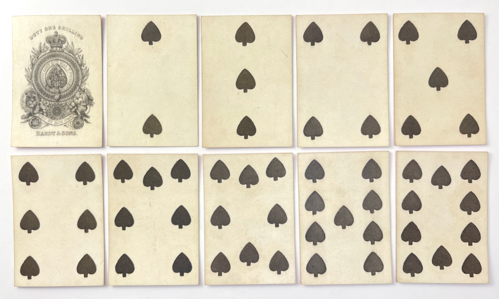 Cards in good condition, complete 52/52 cards, with signs of some wear from use; occasional stains and light toning, minor surface scuffing and soiling; five of Diamonds with corner crease. (see photographs)