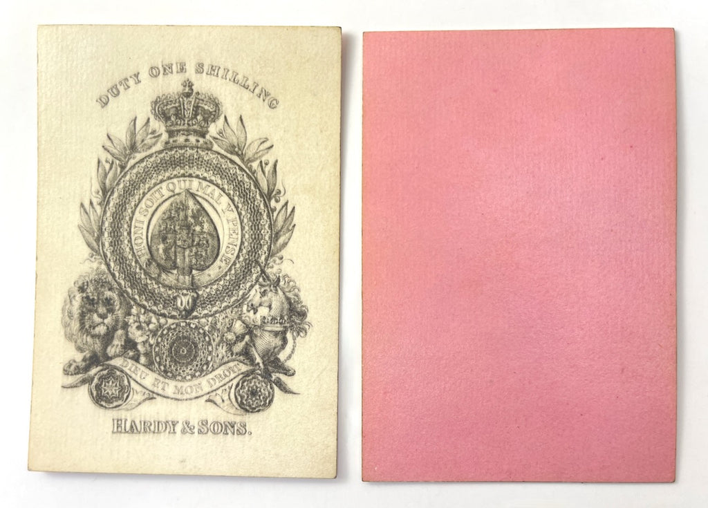 Deck:  Hardy & Sons English Standing Courts, duty one shilling Old Frizzle Ace, "Dieu et Mon Droit"