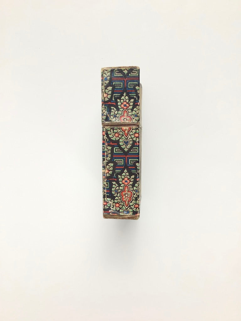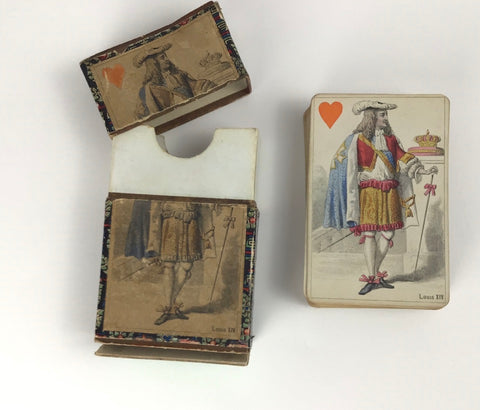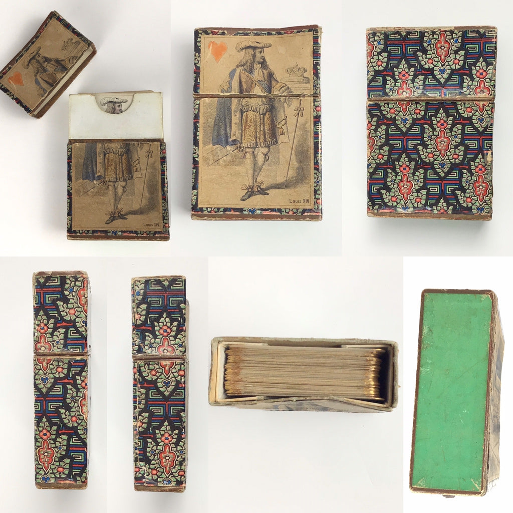 · Box: with Louis XIV (King of Hearts) on the front, and red, black, and green patterned paste paper.
