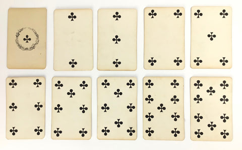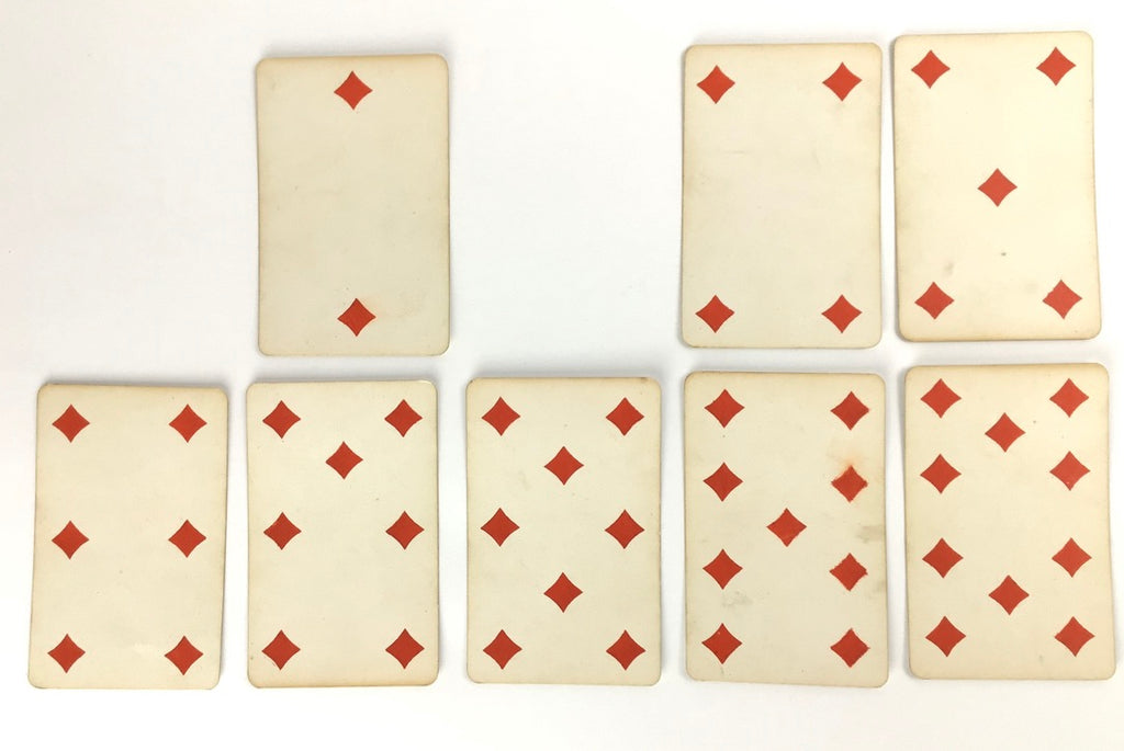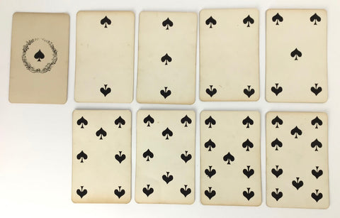 Good condition. Cards in good condition, with minor marks, stains, and age discoloration. Missing Ace and 3 of Hearts; 6 of Spades; Queen of Diamonds and Clubs. Box missing the top flap of the upper portion, bottom flap present but detached.