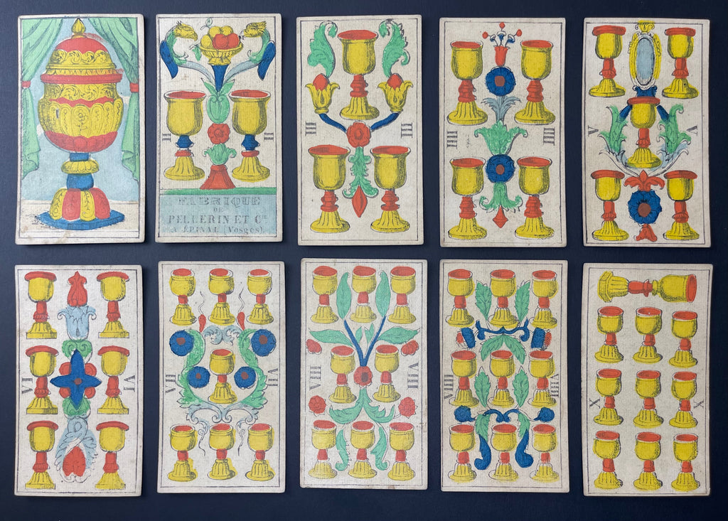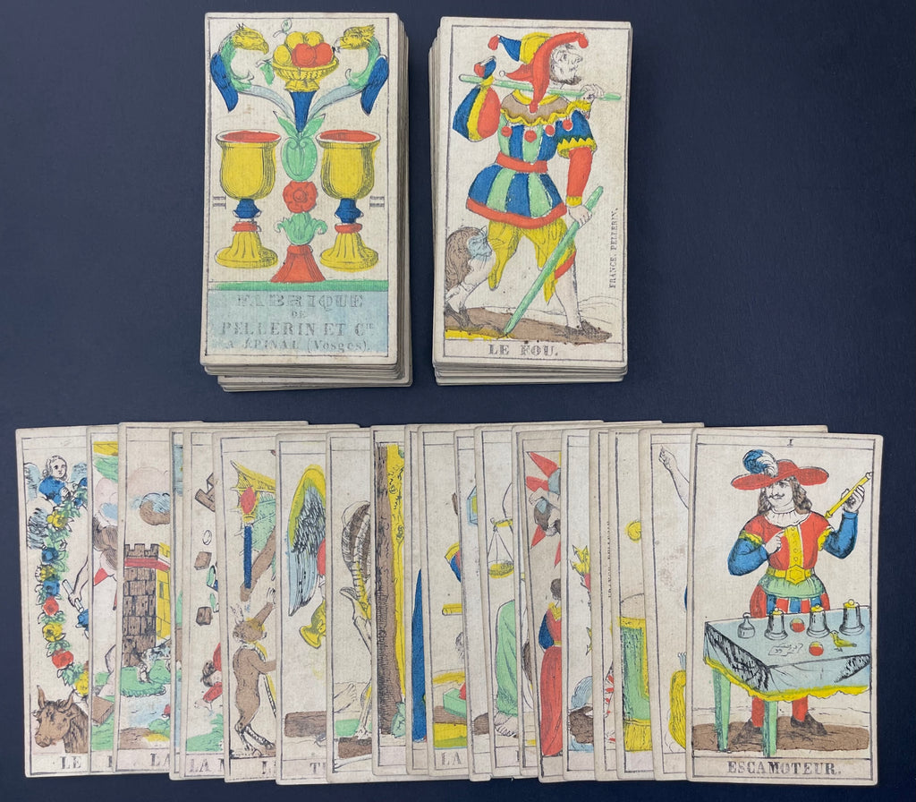 "The Épinal tarot cards are believed to have been first published in 1830 by the art printers Pellerin & Cie, who were established in the Vosges district of France since 1796 ... The cards were in production until the 1870s." [Rod Starling 2013 (2022), WOPC].