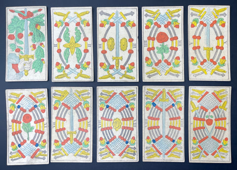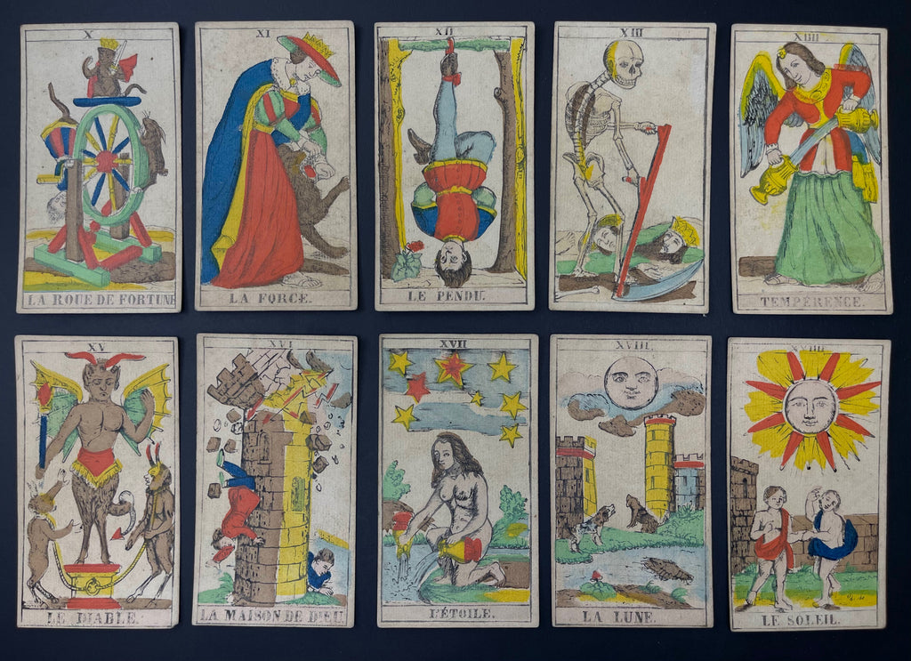 Description: Complete (78/78 cards) copy of the Épinal Tarot, printed c.1860. The woodcuts were produced by the famed engraver François Georgin (1801-1863), and the deck was published by Pellerin & Cie. for over forty years.
