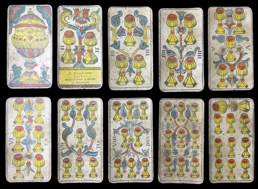 · Cards: J.I. on the shield of Arcanum VII (Le Chariot); brand label on 2 of Cups: "J. Blanche /Succr de Renault/ Fabricant du Tarot de Joerger/a Besançon"; "J. Blanche, a Besancon," printed on the margin of most Marjor Arcana/Trumps and Court cards.