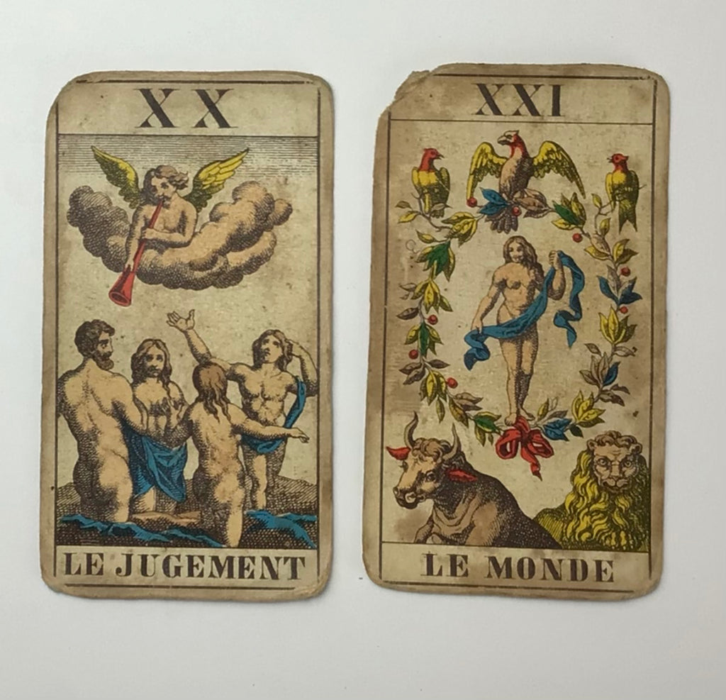 Description: c.1900 Schaffhouse tarot deck with Junon and Jupiter by J. Müller, complete with 78/78 cards. The deck is in the same style as the cards later popularised by US Games as "1JJ Swiss."