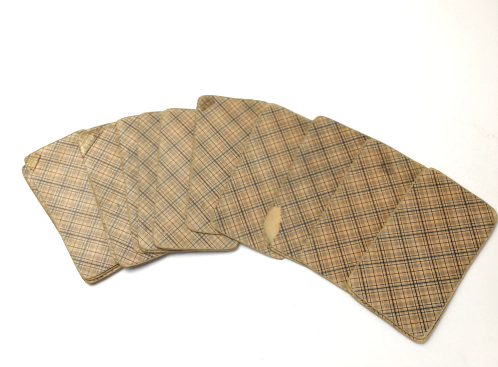 CONDITION: Fair to good condition, complete 78 of 78 cards,; all cards have signs of heavy use, with significant corner and edge wear, including soiling with signs of discolouration and patina; some corners clipped, ripped, or folded; with amateur tape repairs browning on a number of cards; Versos/backs of cards with chips and other signs of damage (see photographs for more details); the deck has a slight musty smell.