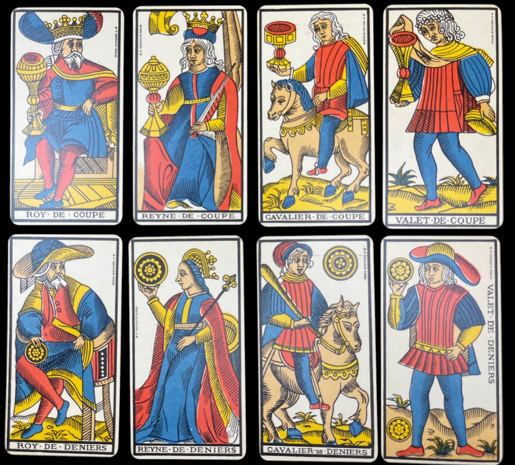 - "B.P. Grimaud, Paris" copyright written on all of the court cards; copyright also written on all of the Trump cards except XVI, XVIII, & XVIIII.