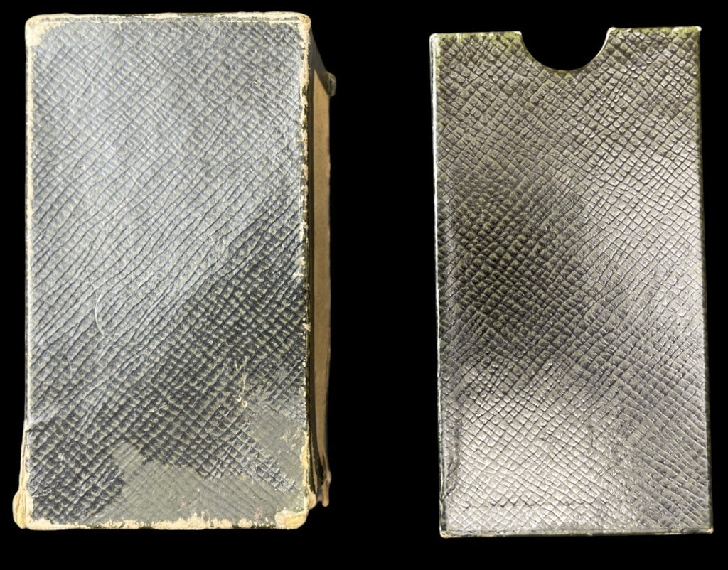 This is a rare early edition of the Ancien Tarot de Marseille designed by Paul Marteau and published by B.P. Grimaud, Paris, France. Marteau designed the cards after a c.1880 deck printed by the renowned card-maker Phillippe Camoin. Camoin himself printed the deck with his well-known colour palette of yellow, red, blue, and green using woodblocks originally carved by Nicolas Conver in 1760. Paul Marteau’s redesigning of the deck made this colour combination famous, becoming perhaps the most well-known 20th-century printing of the Tarot de Marseille. Made with exceptional quality, this early Grimaud deck is well preserved on paste-board card-stock and with its original two-sleeve telescopic box.