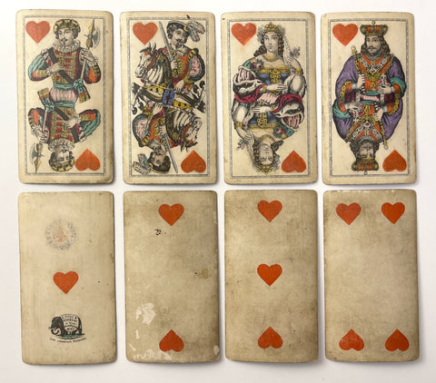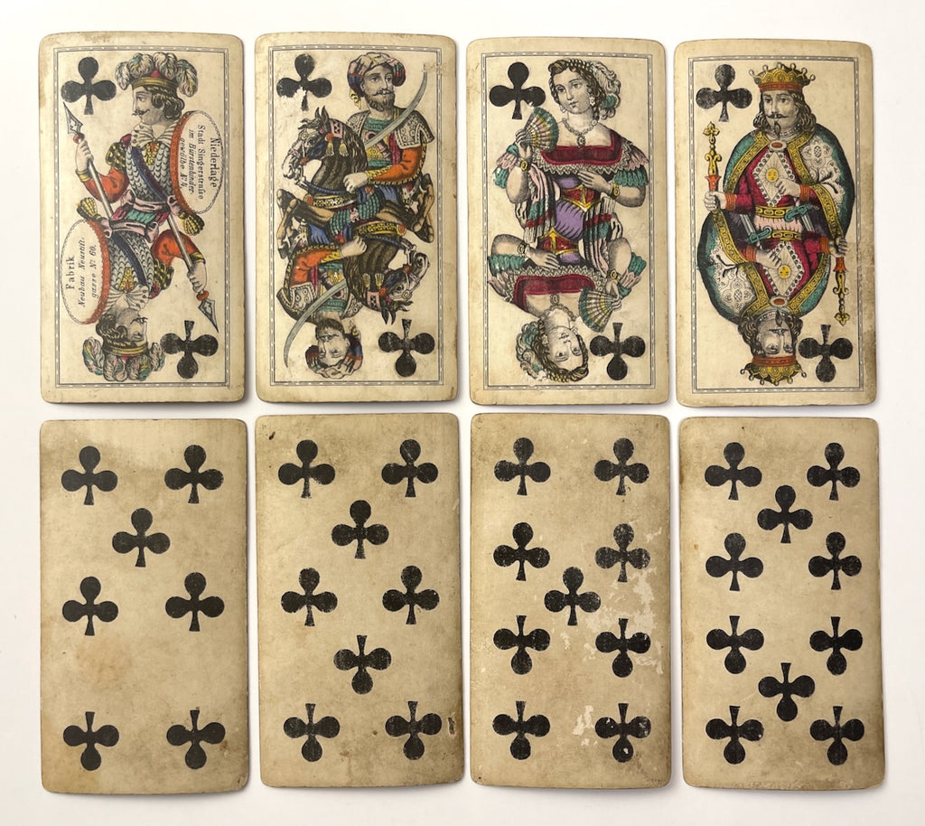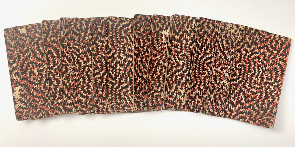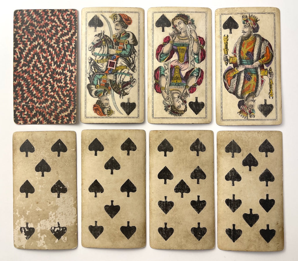 CONDITION: Good condition, incomplete 53 of 54 cards (lacking Jack of Spades); signs of use and stains, as well as minor surface wear, paper scuffing and some paper loss on reverses. (see photographs) |