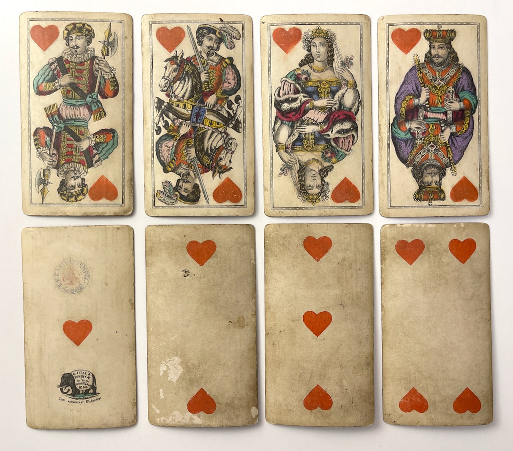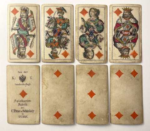 - Indicator Cards: Jack of Clubs with makers brand on shield (Neubau Neustigasse 60); Jack of Diamonds with C. Titze & Schinkay; Ace of Diamonds with coat of arms and 'Spielkarten Fabrik.des C. Titze & Schinkay in Wien'; Ace of Hearts with elephant brand-mark.