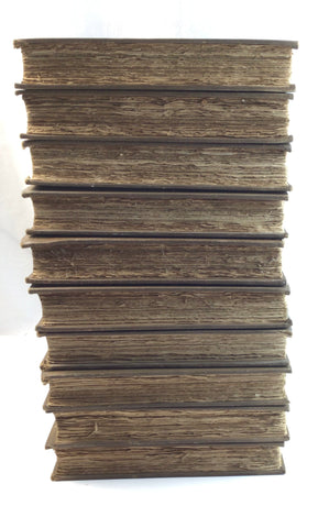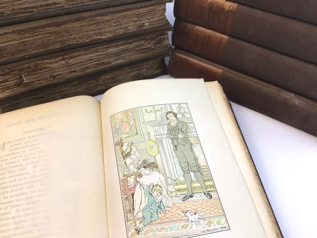 Ed. Brimley Johnson. Letters and Novels of Jane Austen. New York, NY: Frank S. Holby, 1906. Chawton Edition, limited, No. 925 of 1250; 10 of 12 volumes (missing Volume III and V), Hardcover. 8vo; bound in brown cloth with paper labels on spines; title pages printed in red and black; with coloured frontispieces, and several coloured illustrations in each volume; deckled pages.