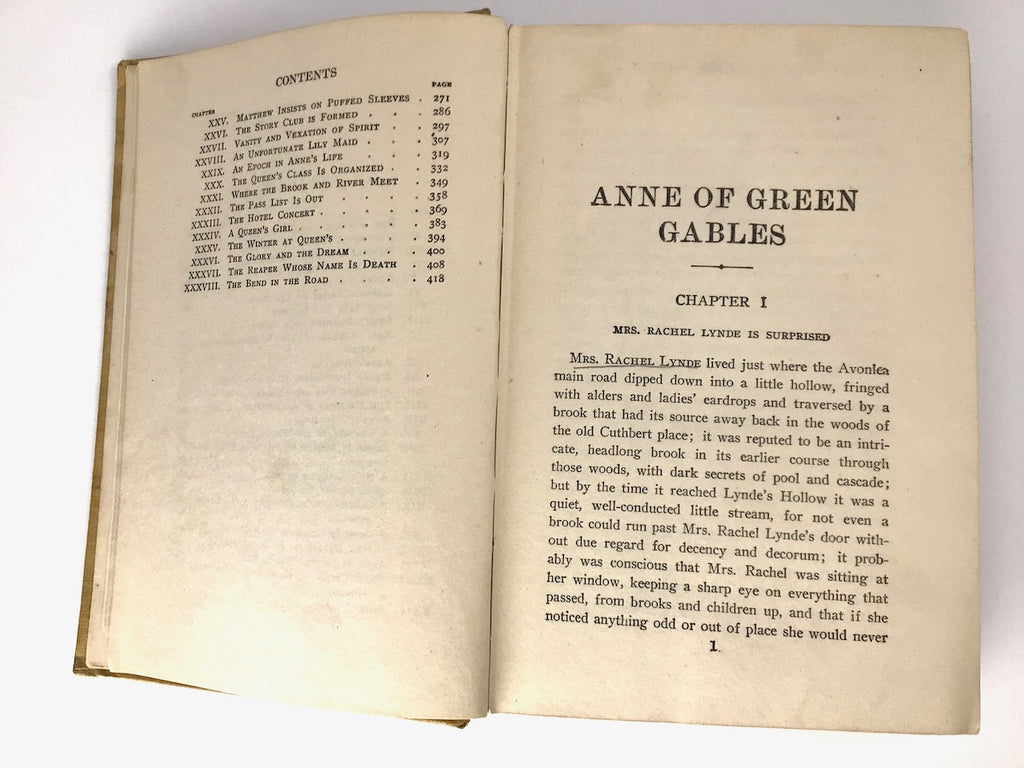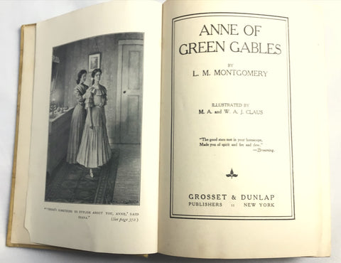 Description: Lovely early printing of Anne of Green Gables (1918) in the beautiful gold/yellow/tan cloth boards, following the style of the 1908 1st edition, with an inlay portrait of Anne-girl, her auburn hair worn up, and perhaps wearing puffed sleeves. Illustrated with 3 plates along with illustrated frontispiece. Complete with 10 pages of advertisement at the rear. 38th printing, of which 150,000 copies were issued.