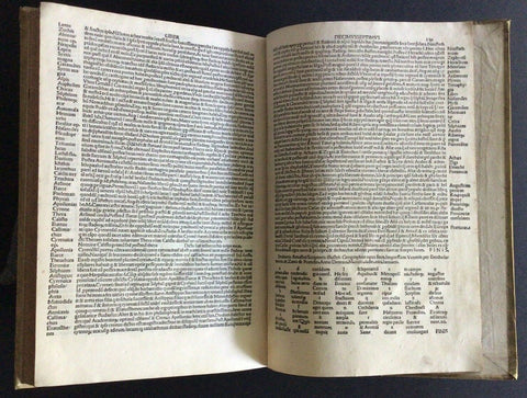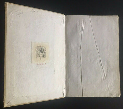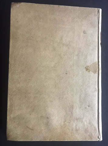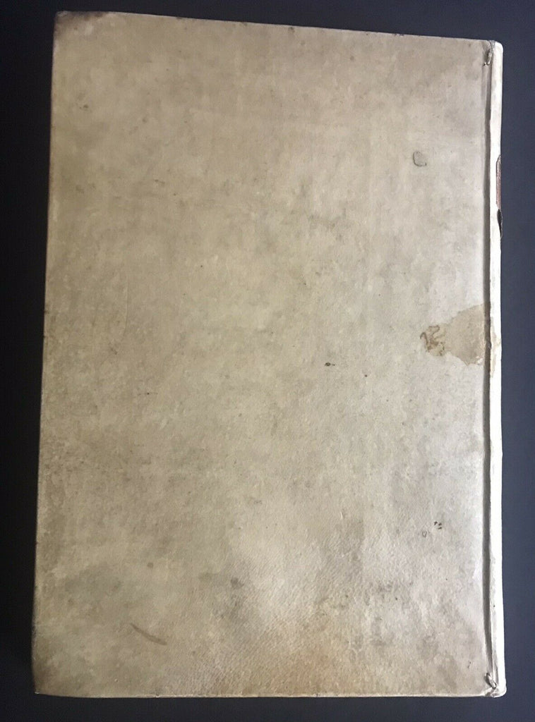 CONDITION: Overall in very good condition, internally with a few small stains, and some antique manuscript notes. Bound in full vellum Italian binding of the 18th century with small lacks and stains. Specific condition details: Leather label peeled, chipped, rubbed. Chip at the bottom left corner leaving a partial letter “O,” and partial framed gilt border. Peeling with some lift from the spine. Ink marks, scuffing and slight discolouration on front boards. Two small rounded marks/stains on front board at edge. Likely a thicker ink blot, or in the case of the lower spot, potentially a small burn. Backboard with small and light stained discolouration of vellum at middle spine-edge. Other marks and scuffs as seen in the pictures. Top outer corner of edge at front and back boards browned. Vellum rubbed at corners. Marbled/speckled edges with small stain of front edges. The spot does effect the inner pages, appearing only at edge. Pencil and pen marking on pastedown with bookplate. Front leaf creased and scuffed. Title page with number 3 written beside title. Black rub on bottom corner, browning at lower spine of the title page. Text block clean with some foxing and brownish discolouration. Text underlined in pen with ink notes in Latin throughout. Back pastedown with pencil and ink markings and small rips or worm holes on back pastedown near spine. BOOK MEASUREMENTS: In-folio (21 x 30 cm) TOTAL LENGTH: Complete. (16), 150 leaves. |