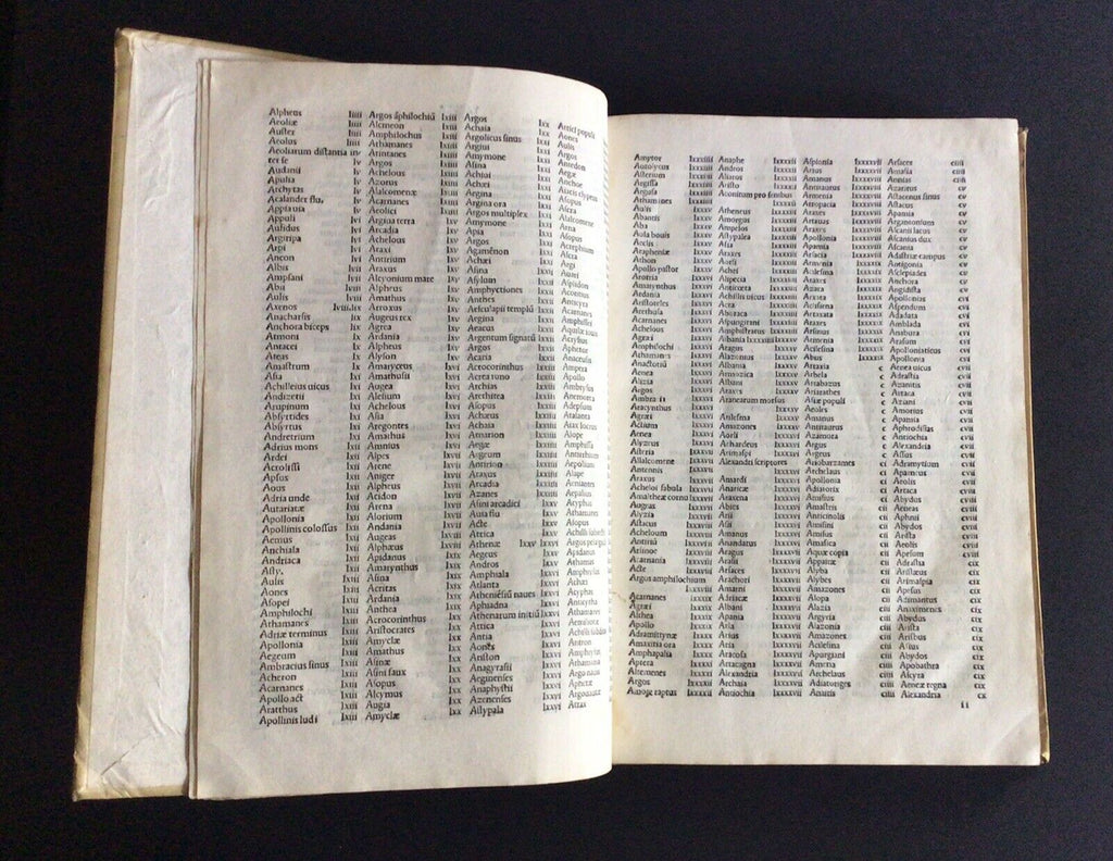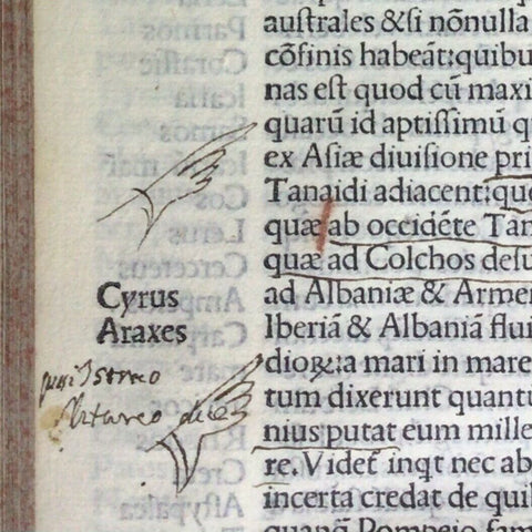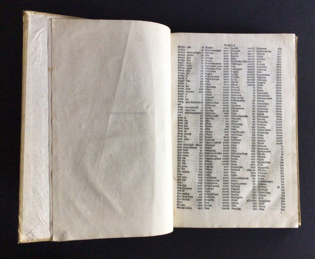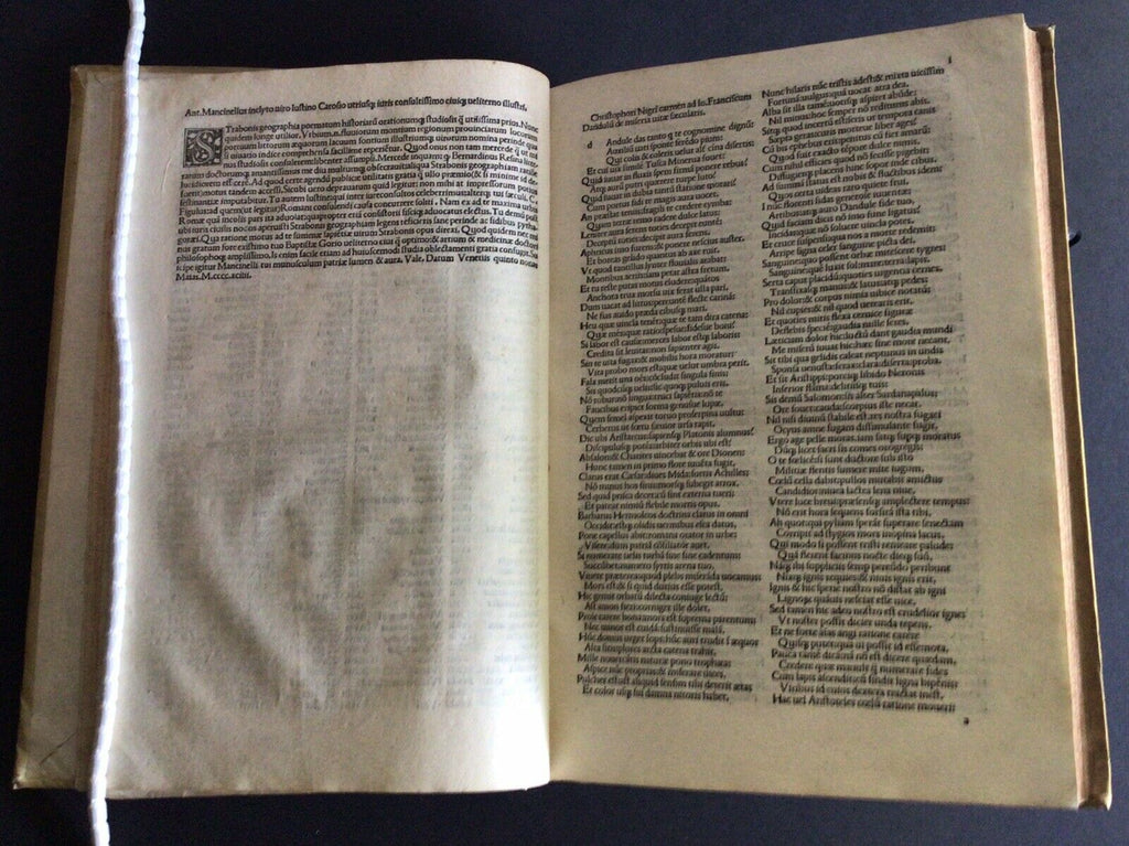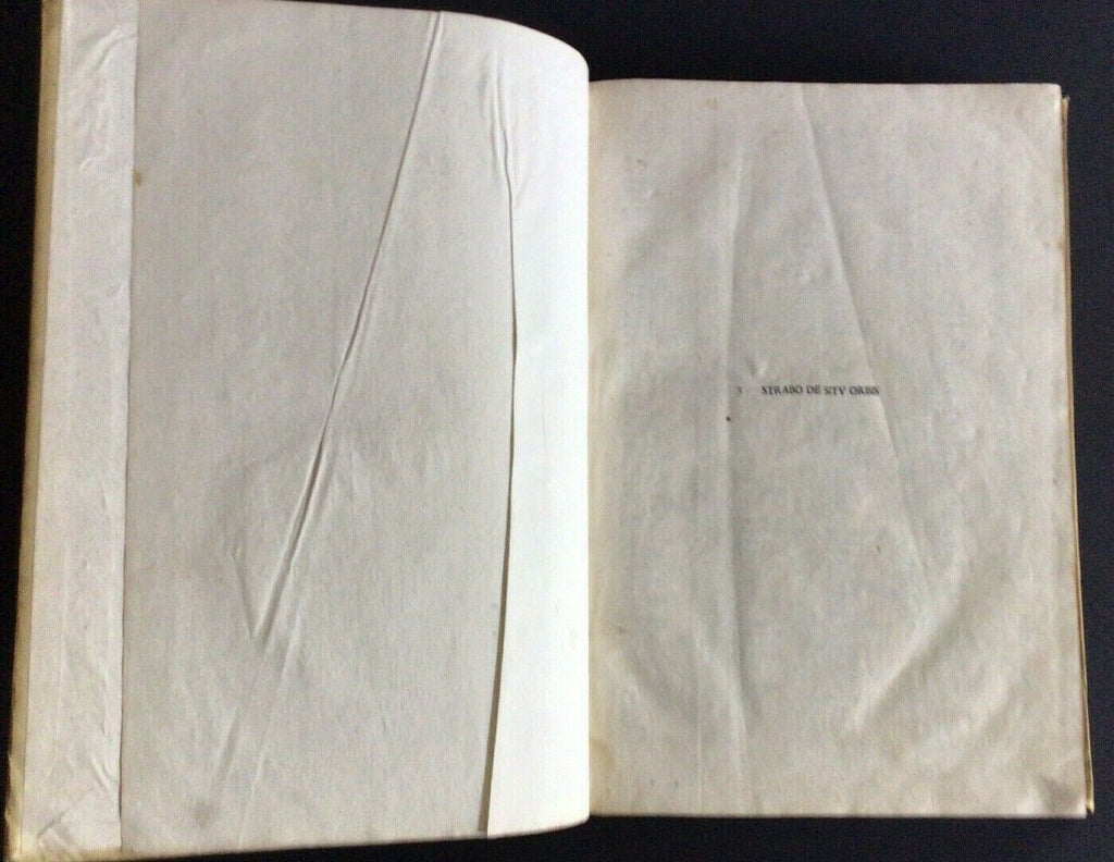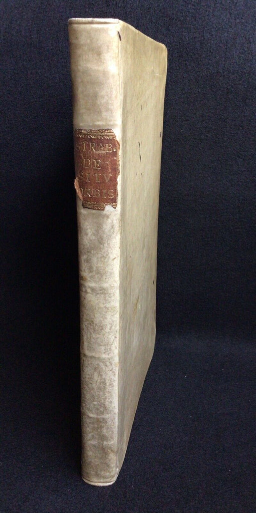 Rare post-incunable 1502 sixth edition of Strabo’s Geographica, translated to Latin as De Situ Orbis by Guarino da Verona and Gregorio Tifernate. The text contains woodcut initials and a table of names and subjects housed in full vellum Italian binding of the 18th century. Imprint from colophon. Edited by Antonio Mancinelli (as appears in the preface dated 1494).