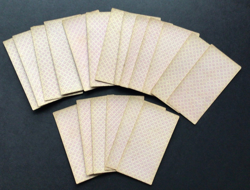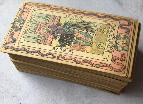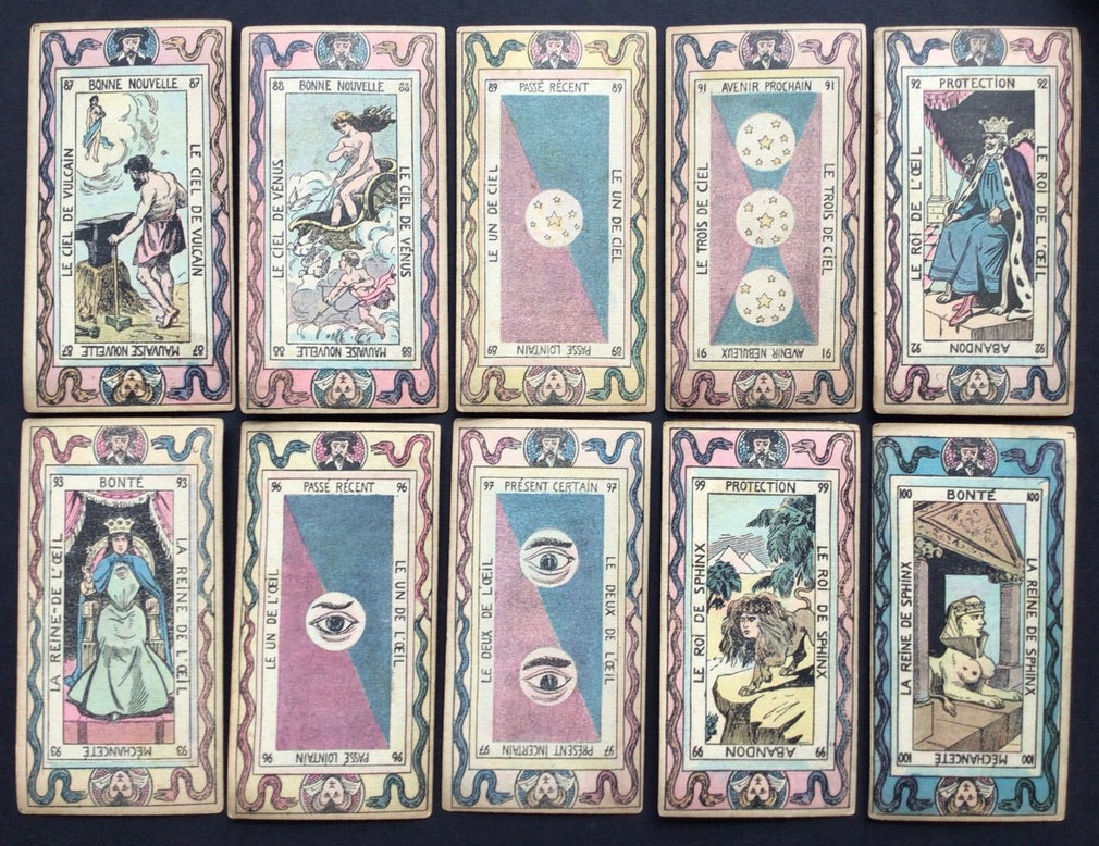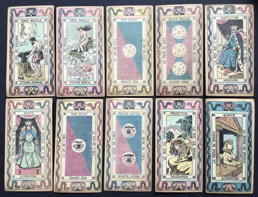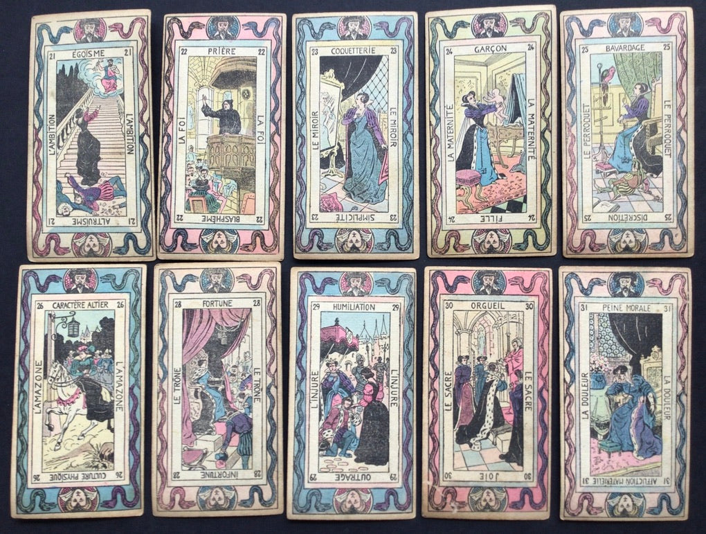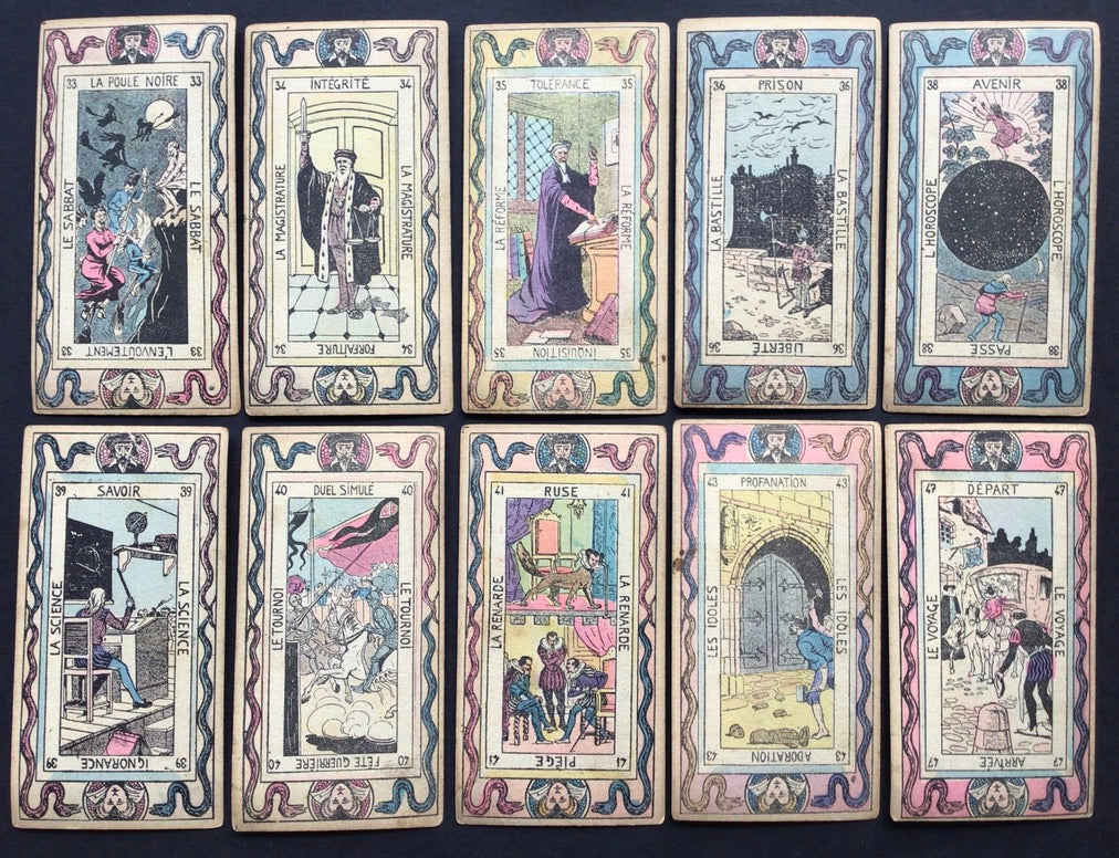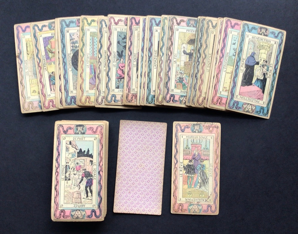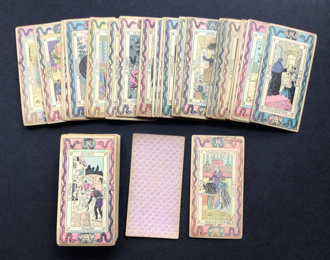 Description: This is an incredibly scarce deck with a unique design. The original deck consisted of a total of 120 cards, the example for sale is missing 40. The cards were illustrated by Henry Steimer. "Steimer was an early French comic artist. He appeared in numerous publications of the 1910s and 1920s," including illustrations for the 1904 French edition of Sir Arthur Conan Doyle's novel, Uncle Bernac, published as Le Roman d'une jeune fille. The booklet originally accompanying the deck has a foreword by Maurice Lanra. On the front of the booklet, the name "Maguelone" is found at the very top.