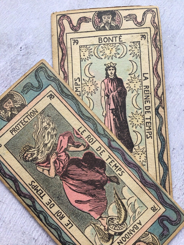 Maguelone writes that each septenary or suit is organized around one of "Les Sept Pensées de Nostradamus:" la Terre, le Temps, le Ciel, la Conscience (L'Oeil), le Mystère (Sphinx), la Fatalité (Fatum), la Justice (Main). Each of the seven sets is comprised of a King, a Queen, two cards named after a celestial body/event or an ancient god (sometimes both), as well three cards numbered 1 to 3 in each "suit." (e.g. #78 Le Roi de Temps, #79 La Reine de Temps, #80 Le Temps de Saturne, #81 Le Temps de Cybèle, #82 Le Un de Temps, #83 Le Deux de Temps,