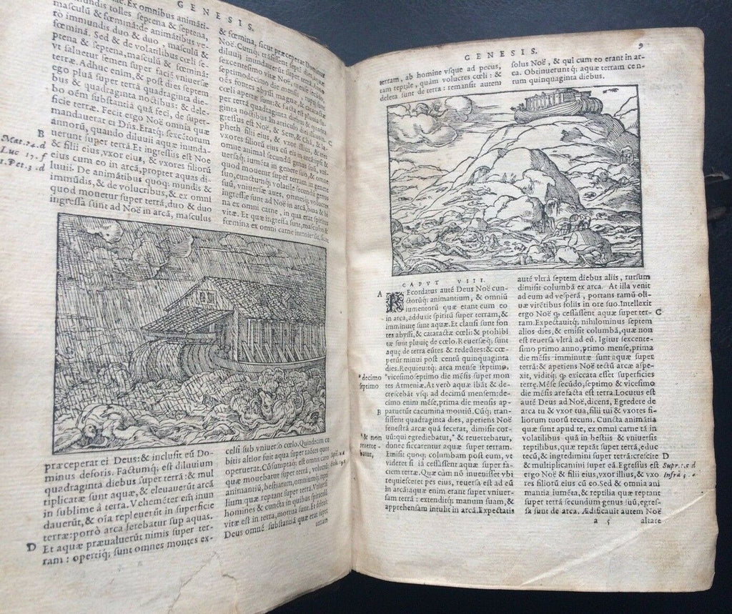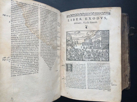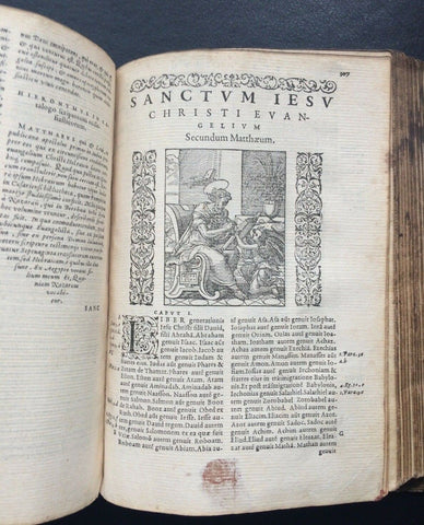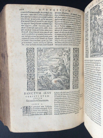 Rare illustrated Latin Renaissance Bible published by the famed Lyonnais printer, Jean de Tournes in 1558. It is a re-edition, page for page, printed with the same type as the previous 1554 edition. Richly embellished with 198 woodcut illustrations by Petit Bernard, with 115 in the Old Testament and 83 in the New Testament (Cartier, 391). The in-text woodcut vignettes appear throughout and are superbly rendered. Title page presented in a frame engraved with arabesques. Each of the New Testament woodcut prints is also framed on both sides by a vignette of arabesques. Text is presented in two columns with marginal notes, both printed and handwritten. Embellished with ornate capitals and endpieces. Without the first blank sheet on which appeared the printer brand of Tournes. Includes an index for the Old and New Testaments, as well as notable sentences of the New Testament.