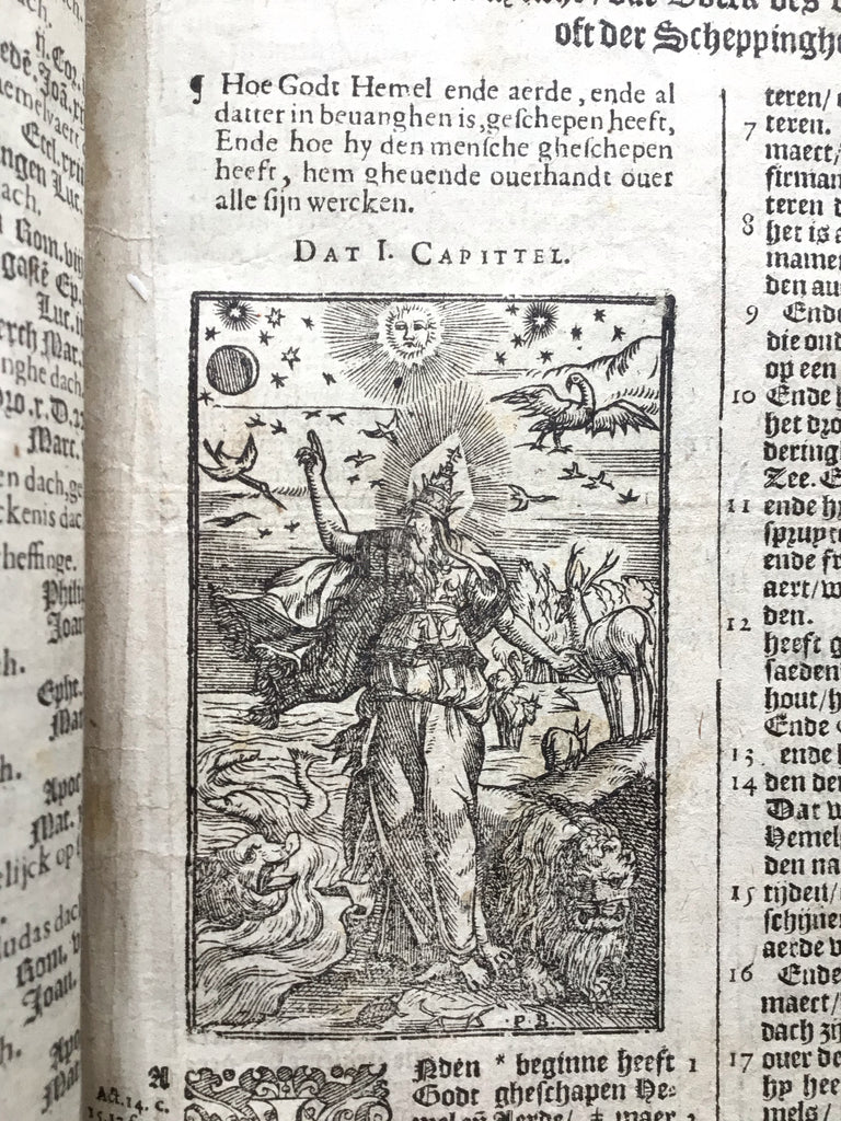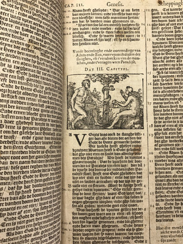 The first woodcut signed P.B. is by Peter van der Borcht, a famous artist, etcher, and draughtsman who worked for Christopher Plantin. The rest of the woodcuts are mostly after Sebald Beham's 1533 designs, first published in his Biblisch Historien. Beham is counted among the best of the "Little Masters" or "Kleinmeister," a group of German printmakers "so named because of the small size of their plates"(Griffiths 1996, 42) and the detailed nature of their work. These Benham designs illustrated numerous Bibles throughout the 16th and 17th centuries, including the 1535 Coverdale Bible.