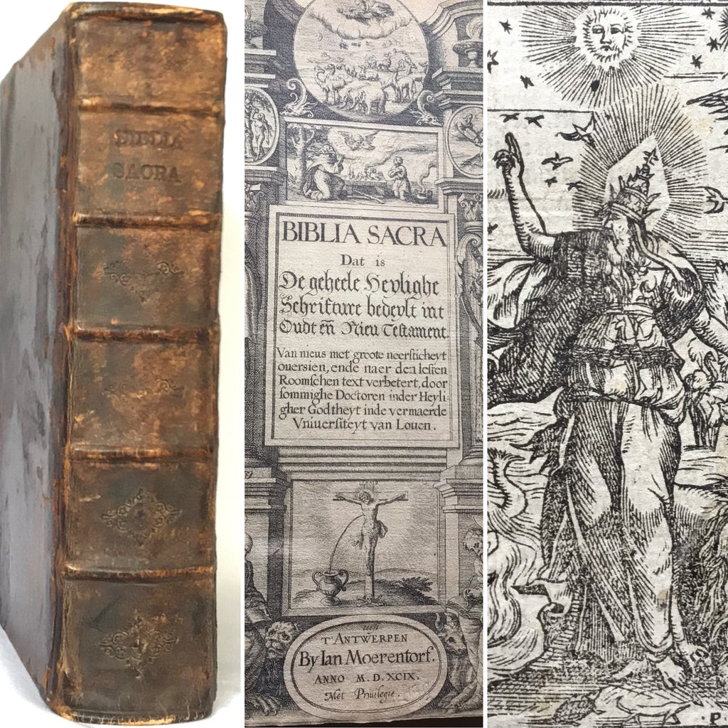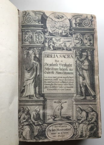 Biblia Sacra. Dat is de geheele heylighe schrifture bedeylt int out ende nieu Testament: van nieus met groote neersticheyt oversien, ende naer den lesten Roomschen text verbetert door sommighe doctoren inder Heyligher Godtheyt inde vermaerde universiteyt van Loven. Antwerp: [J. Moretus & J. van Keerberghen, 1599]. [Typis Danielis Vervliet, & Henrici Swingelij (colophon)].