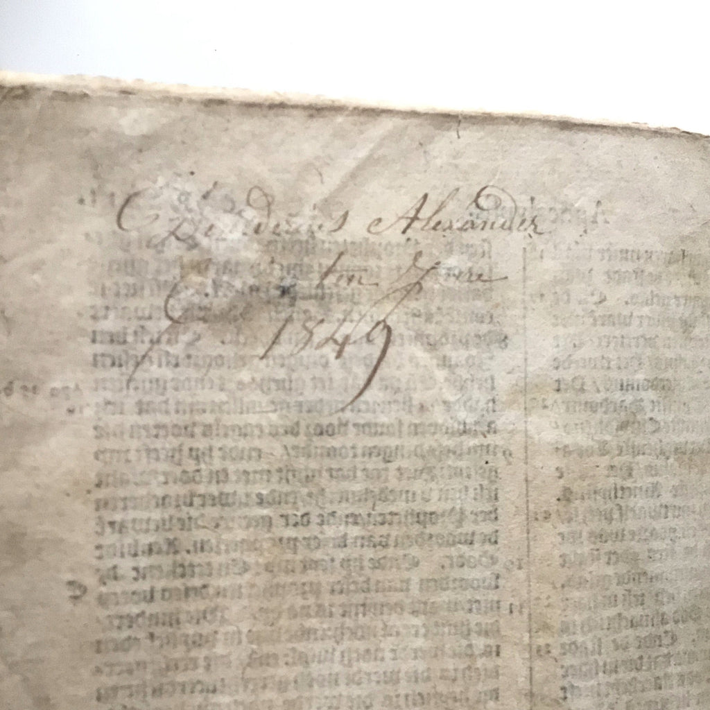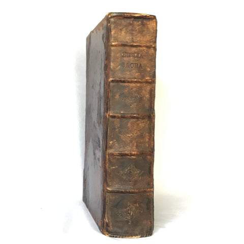 First edition, one of two 1599 issues with first woodcut, initialled P.B., folio, **⁴, A-2P⁶, ²A-2F⁶ ²G⁸, A-Q⁶, R¹⁰ (Ff4 is misprinted as Ee4). Facsimile of engraved, illustrated title page on modern, laid paper, title page from the other 1599 issue (STCV:12912249), which identifies only Moretus as publisher. Printed in Gothic type in 2 columns, with marginal notes; illustrated with 90 small woodcuts, mostly after Sebald Beham's 1533 designs; decorated initials, along with head- and tailpieces. Bound in contemporary calf, rebacked with the original covers pasted on, corners repaired, spine with five raised bands and "Biblia Sacra" blind-stamped.