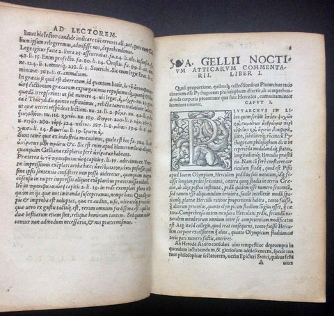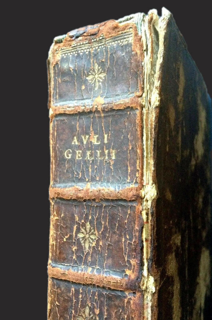 Lacks front title page. Still bound with what appear to be the original contemporary leather boards. Gilt decorations and spine titling remain. Beautifully embellished with many large woodcut engraved initials. Full-page printer's device at end of Noctium Atticarum.