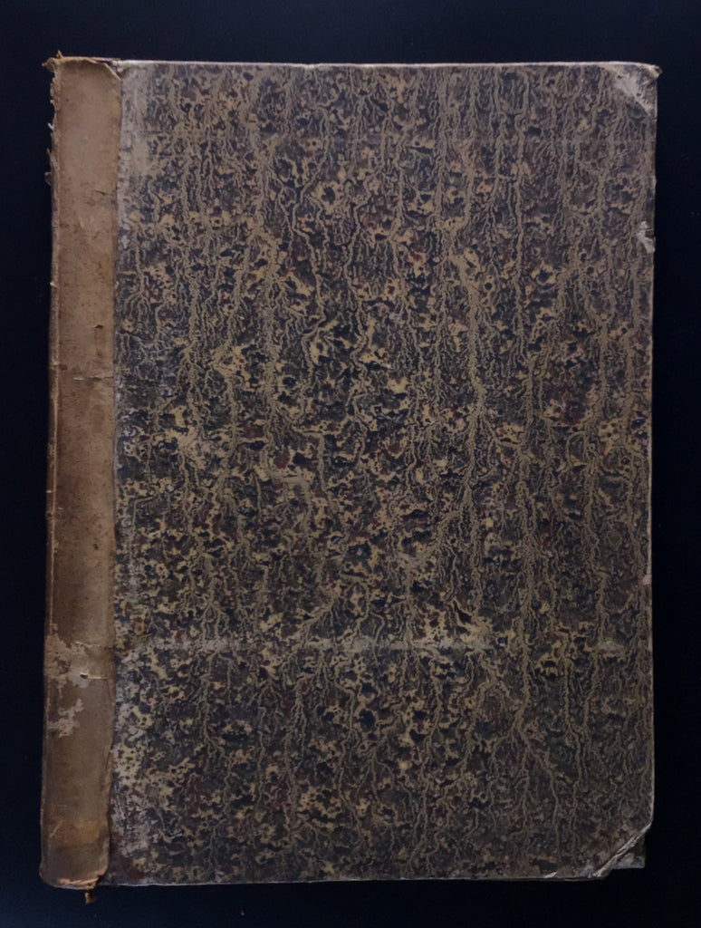 Bound with marbled boards and leather spine. Good condition, with significant peel at the head of the spine with loss of leather and scuffing, corners bumped and other wear of boards (see photographs). The plates are mostly in good shape, with some issues, stains, and discoloration. Because it is a gathered binding of collected pages from other sources, paper edges are frayed, folded, split, and worn. There is a water stain on some pages at the spine, along with foxing and some tears. The plates are still bright. One plate with a diagram of the heart has a large tear through the centre, tearing it almost in half; else good (see photographs for further details).