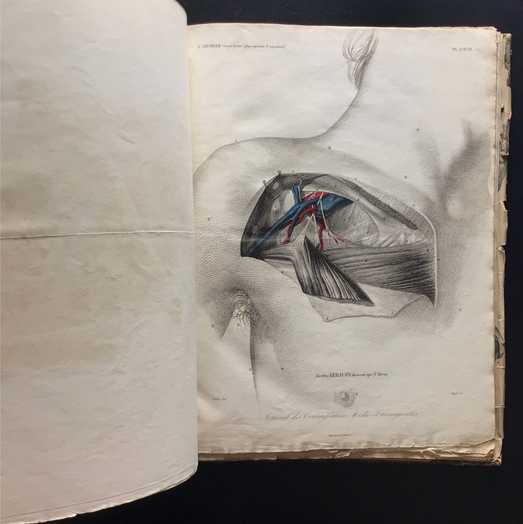 This is an interesting collection of 47 anatomical plates (some coloured) from the Journal des Connaissances Médico-Chirurgicales. Paris, c.1830-60. In Folio. Most plates are numbered with titles, but the numbering is not sequential. The plates were gathered from various sources and bound for specific use in the study of anatomy or surgery. They likely served as a quick anatomical reference. There are 47 plates, all anatomical diagrams of various human parts, including the heart, eyes, skull, neck, chest, leg, and male genitals. Twenty of the 47 plates are coloured.