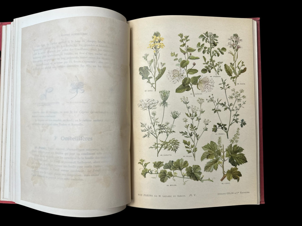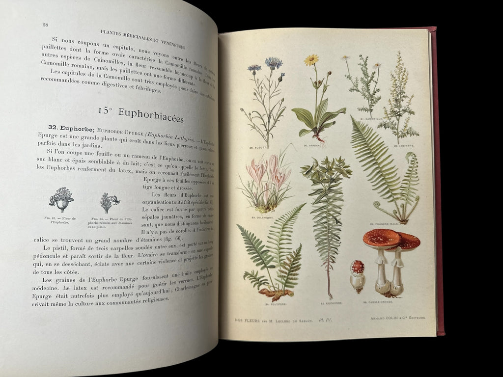 Leclerc du Sablon. Nos fleurs, plantes utiles et nuisibles. Paris: Armand Colin & Cie, Éditeurs. 4to, (I-V)VI-XV, pp132. Decorated red-cloth boards and spine with gold-gilt lettering;]; Advertised as 350 [i.e. 305] botanical figures in black, and 144 chromolithographs, hors-texte.